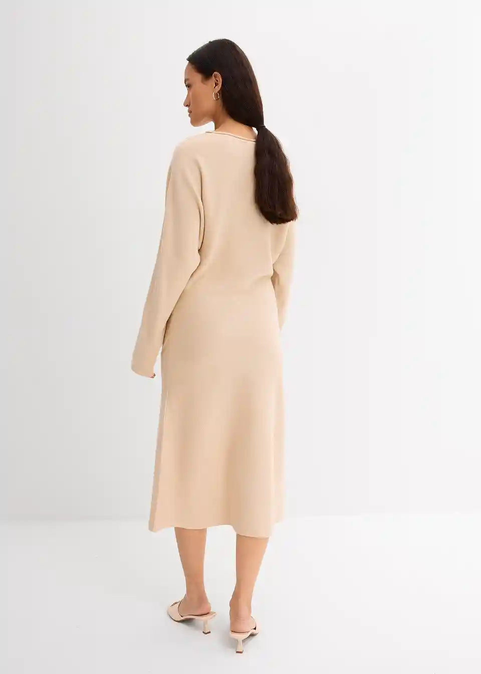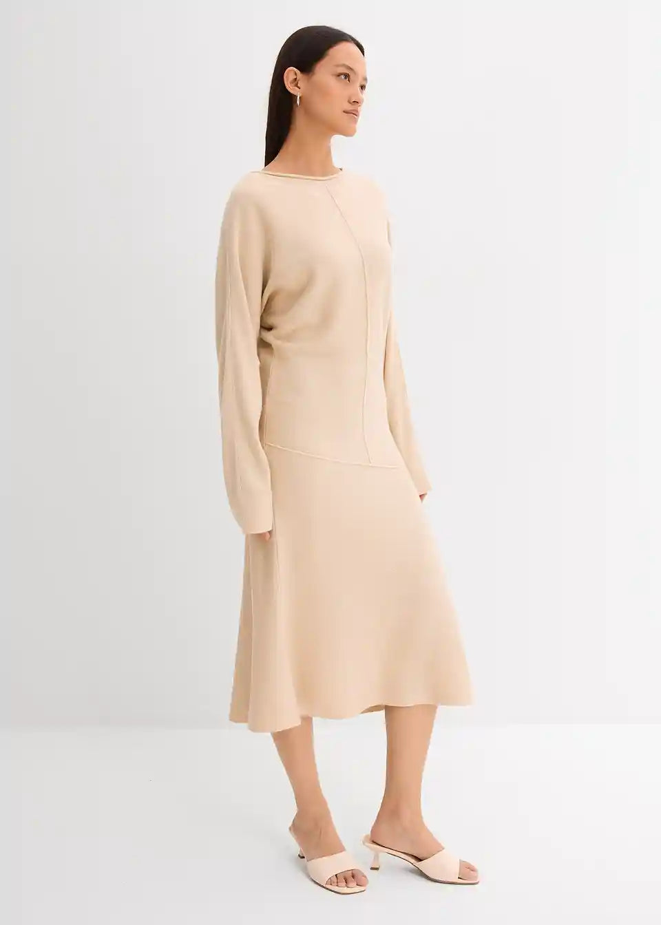 Midi pletena haljina s dugim rukavima, šavovima koji se boji slažu i lepršavom suknjom