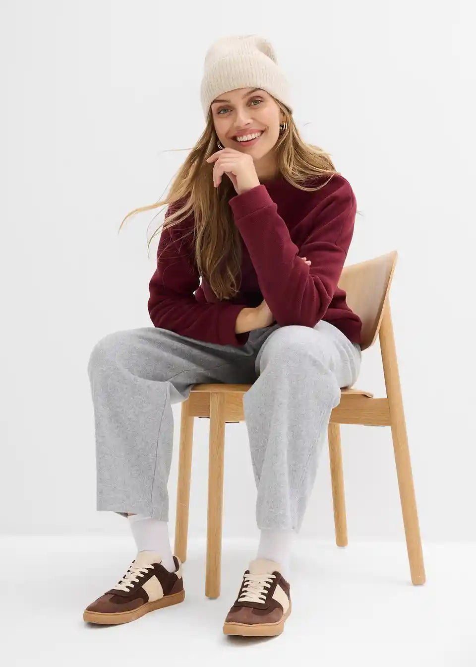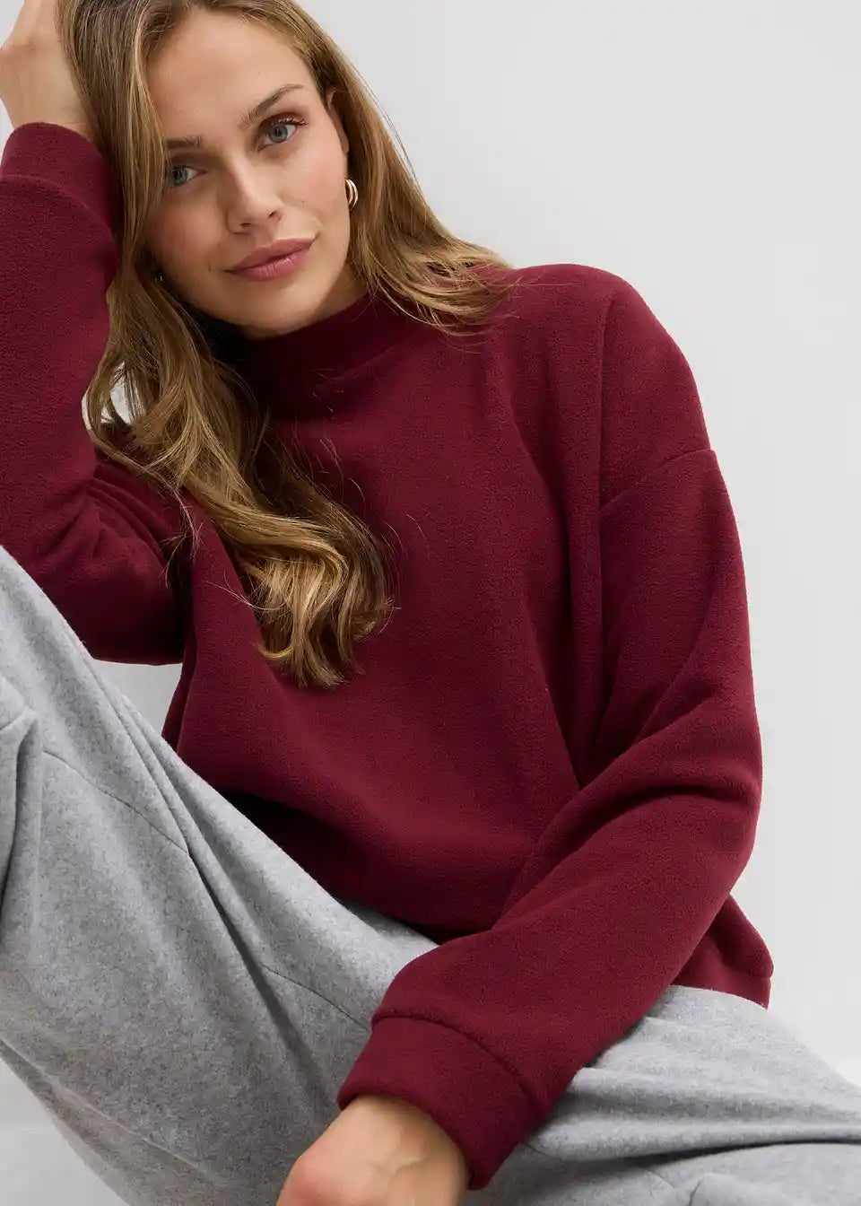 Fleecy pulover širokog kroja. Sa stojećim ovratnikom i spuštenim ramenima.
