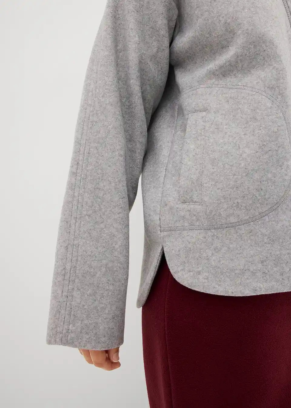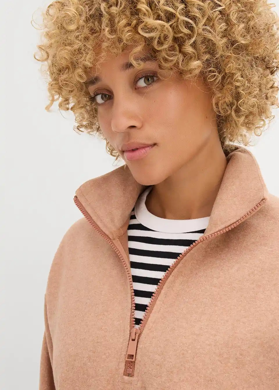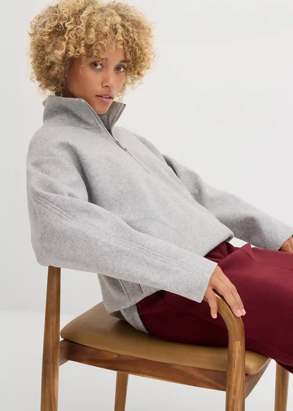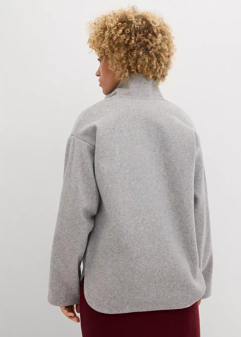 Oversize pulover s visokim stojećim ovratnikom i kratkim patentnim zatvaračem. Spuštena ramena i bočni džepovi.