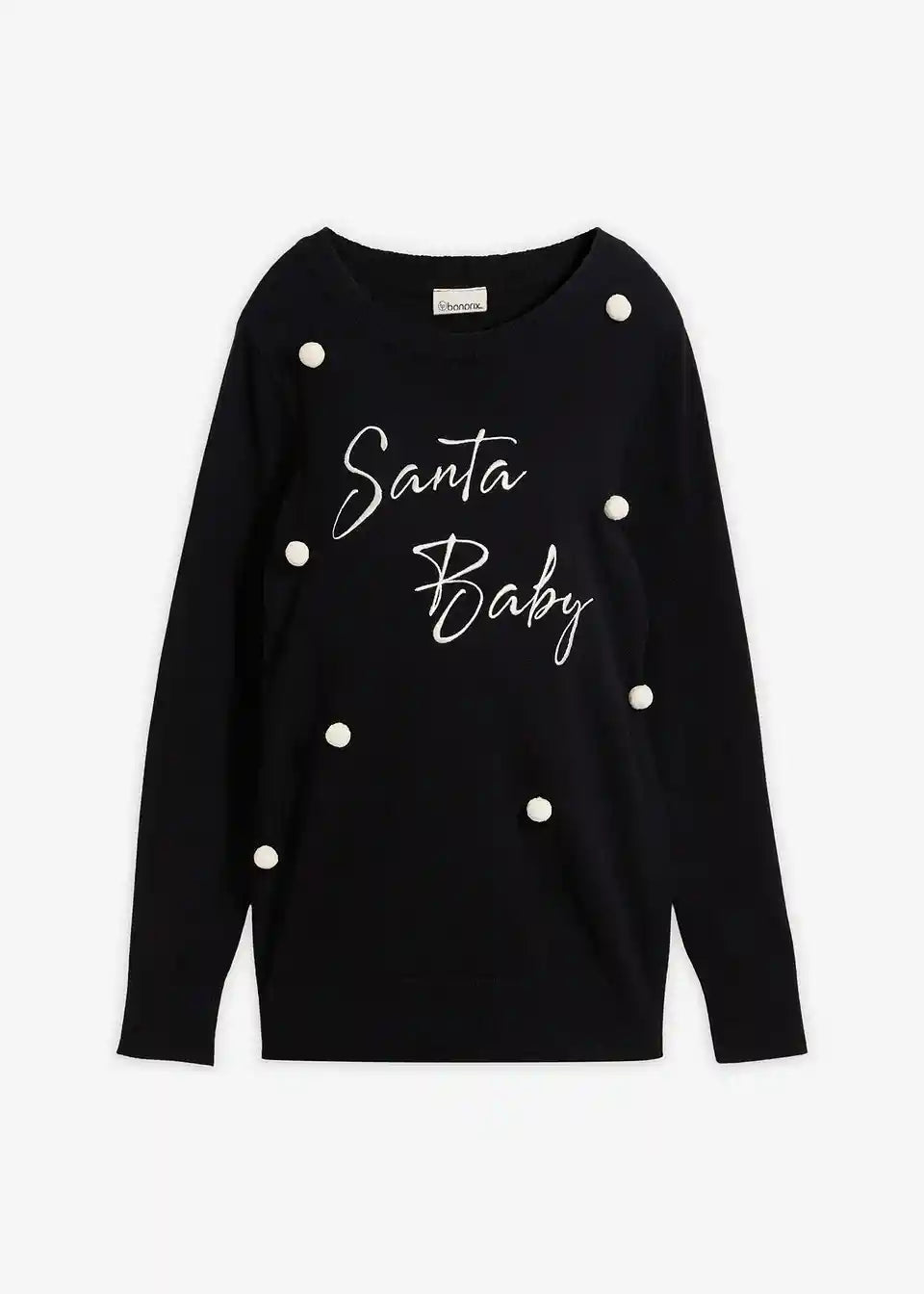 Ovaj trudnički pulover unosi blagdanski ugođaj u tvoj ormar. Sa svojim "Santa Baby" vezenim natpisom i razigranim pomponima daje poseban izgled. Regular Fit duljine do bokova i dugi rukavi pružaju udobnost i slobodu kretanja. Savršen za blagdane – moderan, udoban i idealan za tvoj trudnički trbuh.