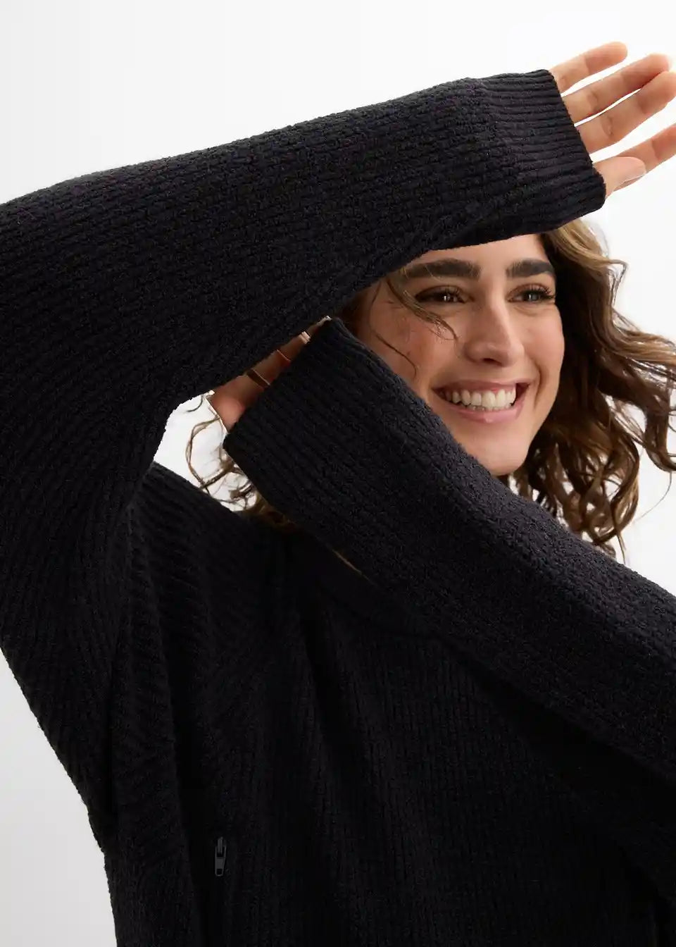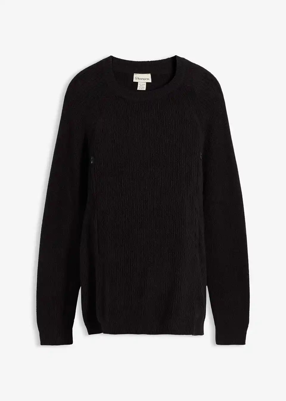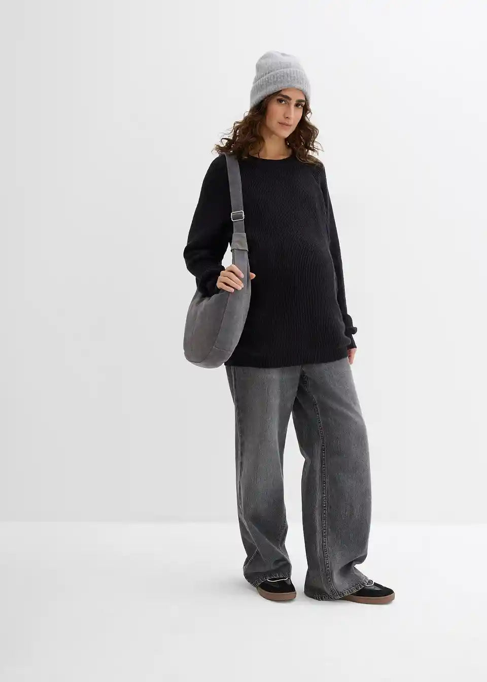 Mekan pulover od grubo pletenog pletiva za trudnoću i nakon poroda s okruglim izrezom. Sa strane su ugrađeni jedva vidljivi patentni zatvarači koji se lako otvaraju za dojenje. Zatvarači su s unutarnje strane podstavljeni tkaninom radi zaštite bebe i sprječavaju izravan kontakt s kožom.