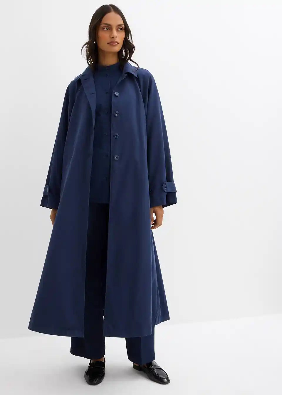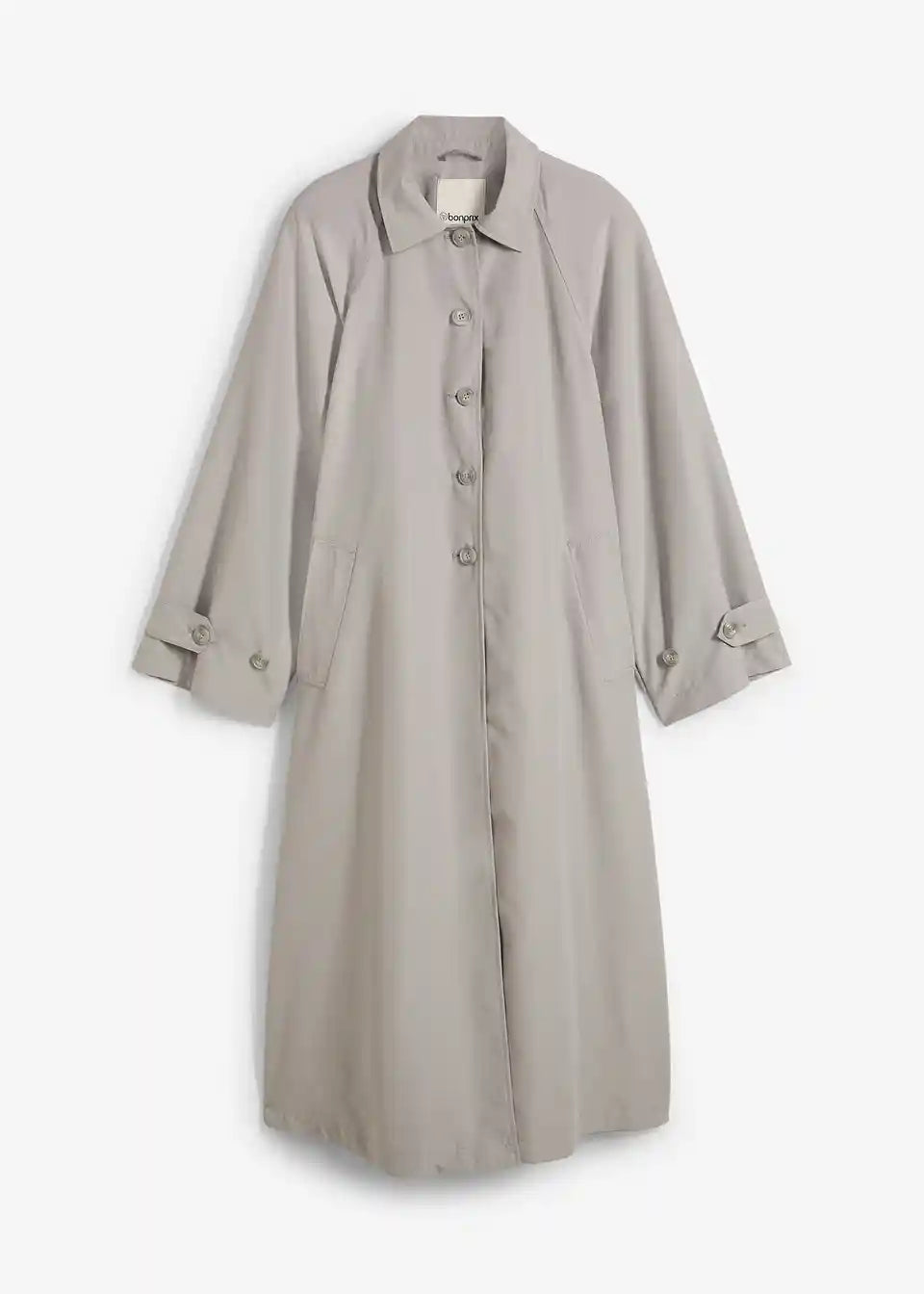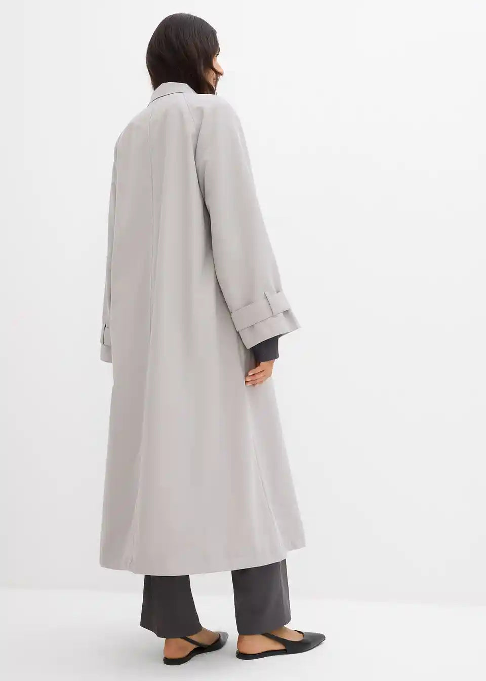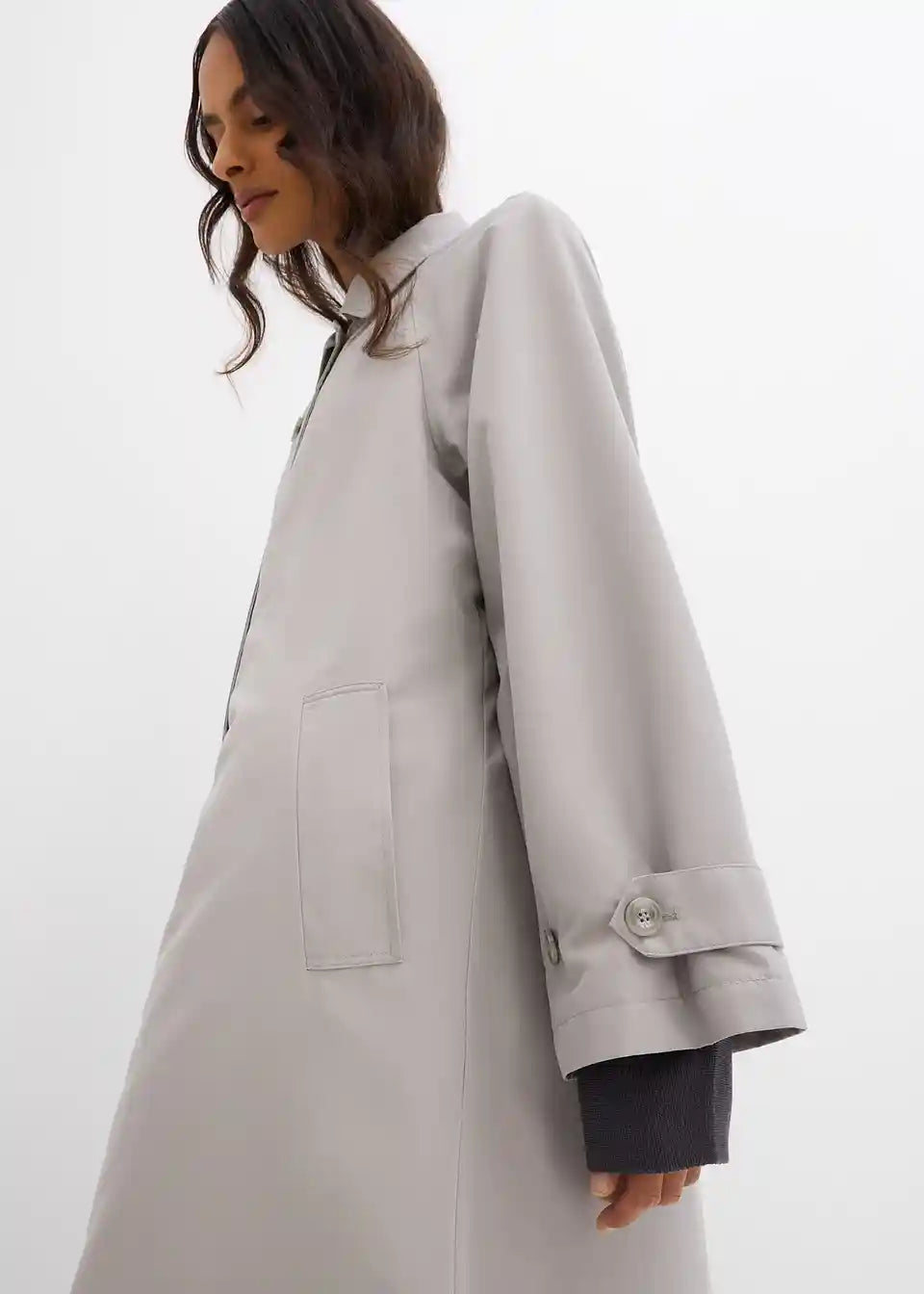 Trenchcoat do listova, jednoredni, s ovratnikom, podesivim trakama na rukavima i bočnim ušivenim džepovima.