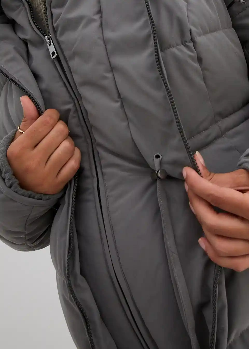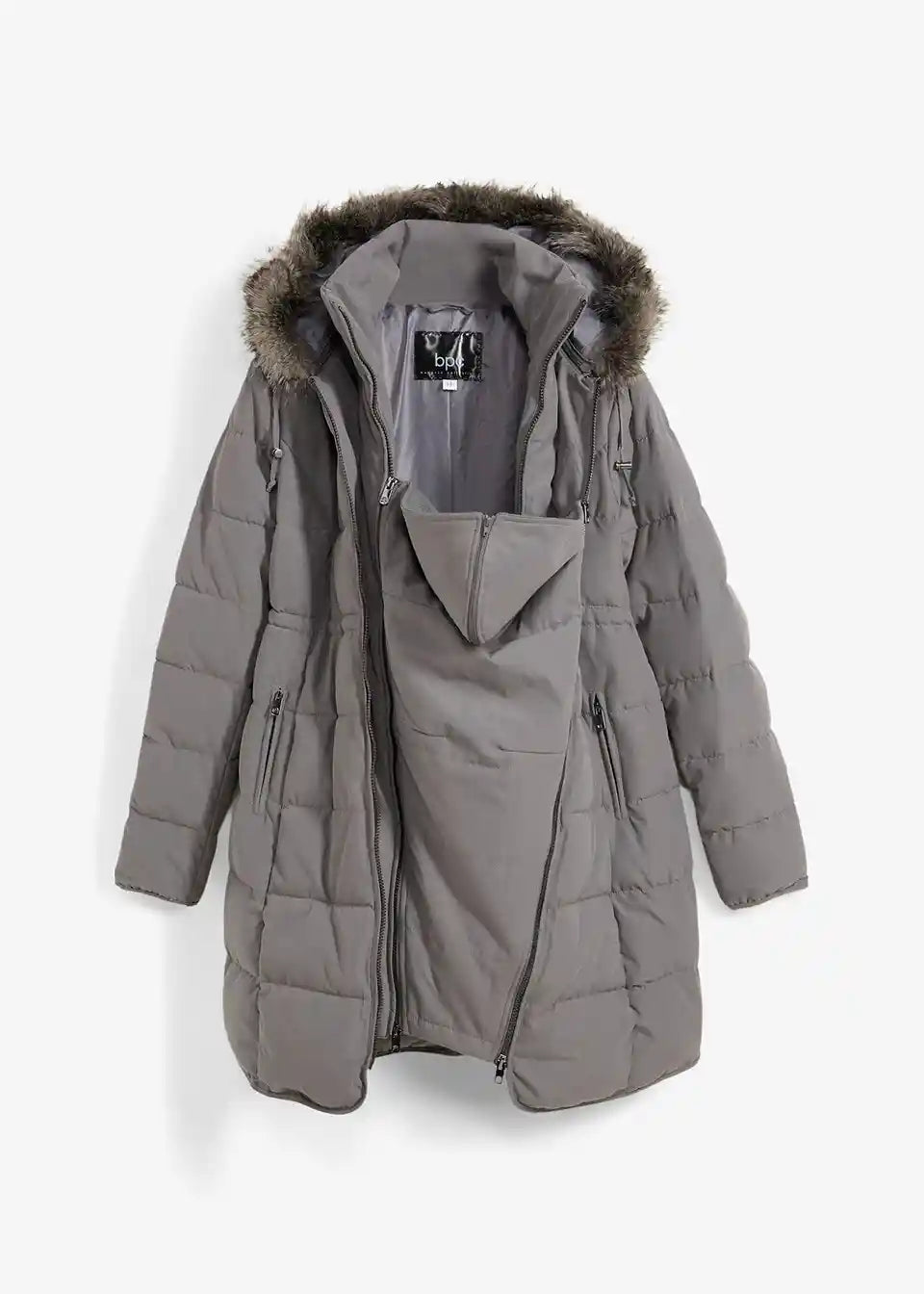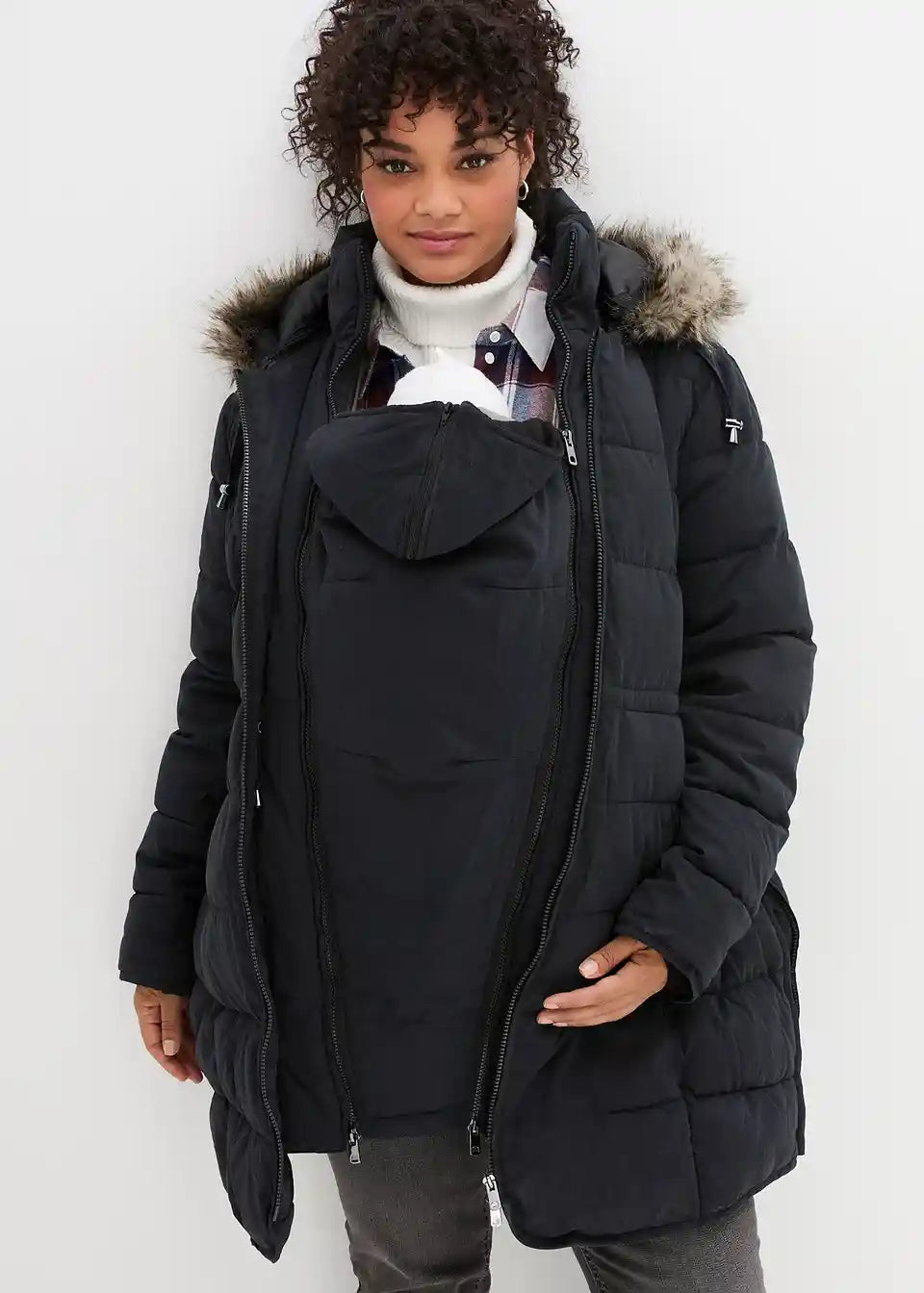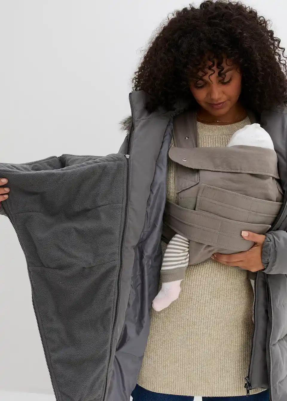 Prošivena jakna s umecima za nošenje bebe i bočnim patentnim zatvaračima za podešavanje širine, što omogućuje nošenje jakne tijekom trudnoće i nakon nje. Odvojiva kapuljača ima aplikaciju od krzna i vezice sa stoperima. Umetak za bebu, praktični džepovi s patentnim zatvaračima i porubi rukava podstavljeni su mekanim flisom. Unutarnja regulacija struka omogućuje dodatno prilagođavanje širine. S dvosmjernim patentnim zatvaračem.