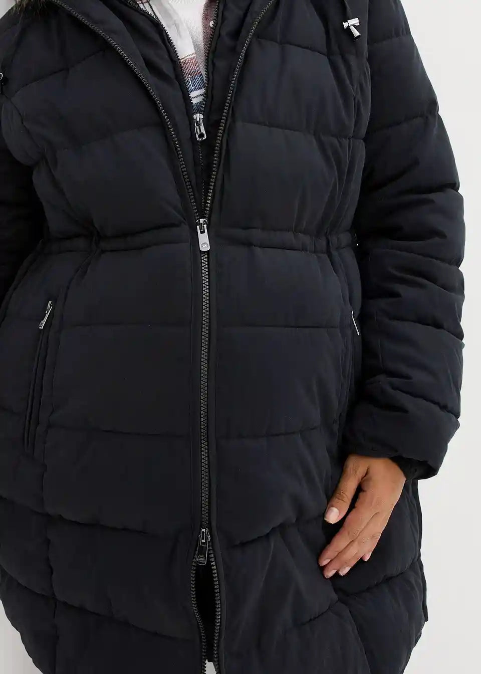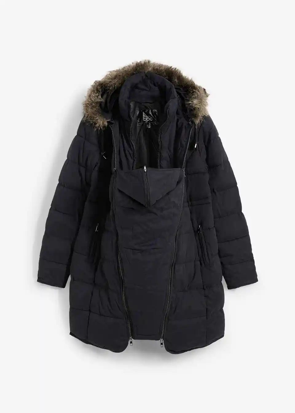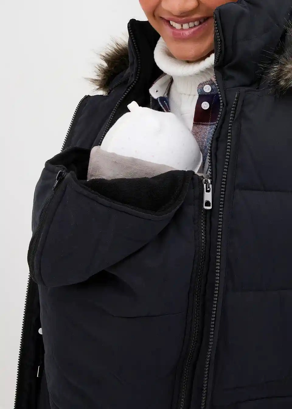 Prošivena jakna s umecima za nošenje bebe i bočnim patentnim zatvaračima za podešavanje širine, što omogućuje nošenje jakne tijekom trudnoće i nakon nje. Odvojiva kapuljača ima aplikaciju od krzna i vezice sa stoperima. Umetak za bebu, praktični džepovi s patentnim zatvaračima i porubi rukava podstavljeni su mekanim flisom. Unutarnja regulacija struka omogućuje dodatno prilagođavanje širine. S dvosmjernim patentnim zatvaračem.