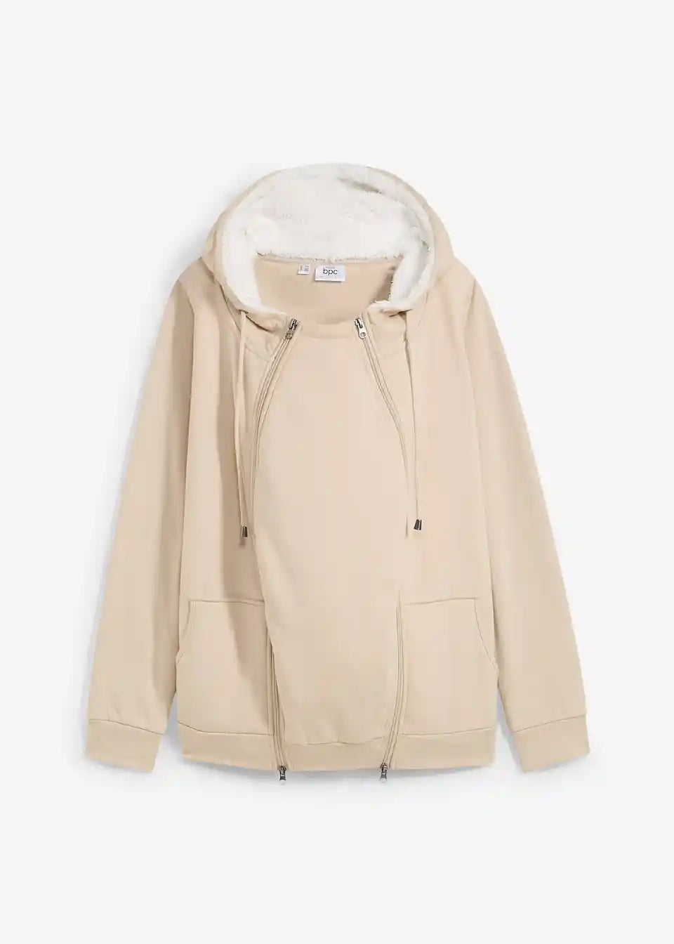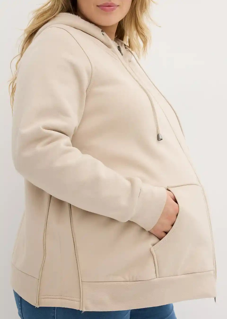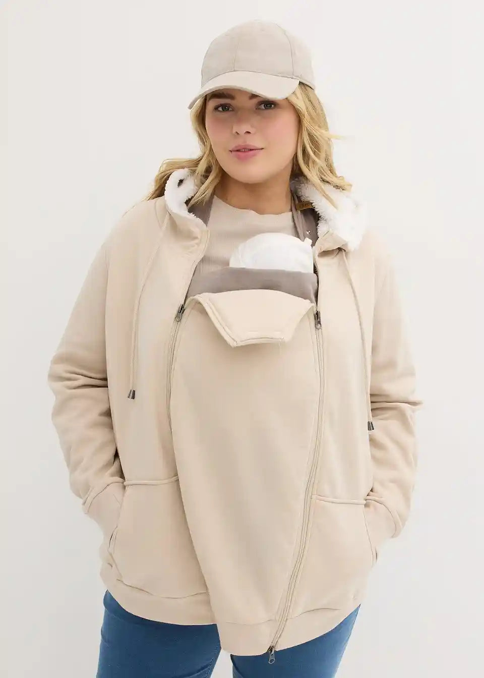 Supermekana sweat jakna za trudnice i majke posebno je praktična jer je opremljena umetkom za bebu. Tako se trudnička jakna nakon poroda može jednostavno nositi preko remena za nošenje bebe. Tijekom trudnoće, elastični materijal prilagođava se rastućem trbuščiću i zato je prikladan za svih devet mjeseci. Kontrastna unutarnja podstava jakne za sweat je posebno mekana i udobna za majku i dijete. Umetak za nošenje služi samo za zaštitu bebe i nema funkciju nošenja!