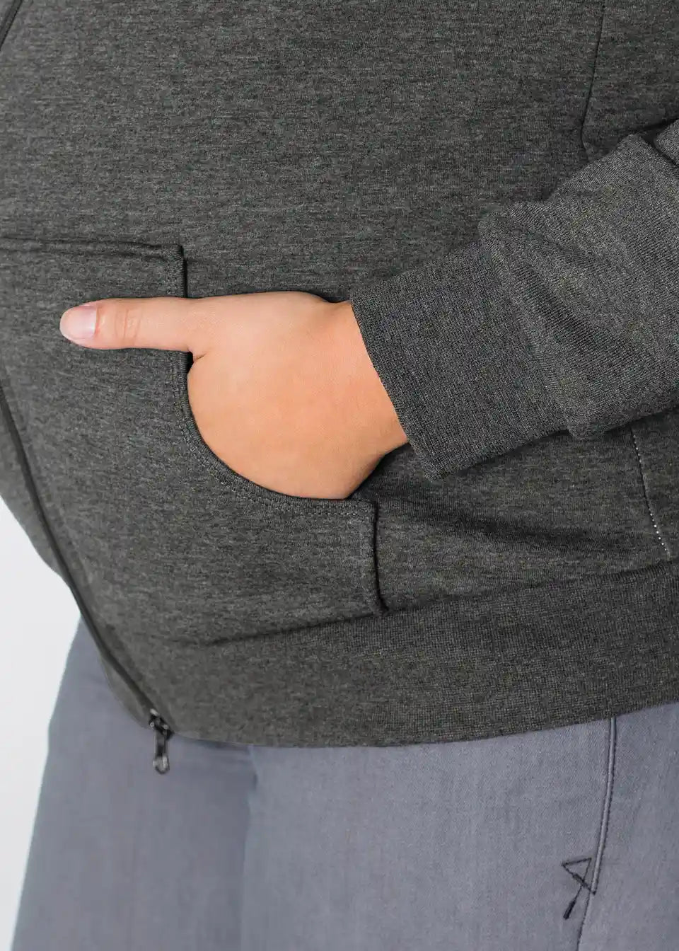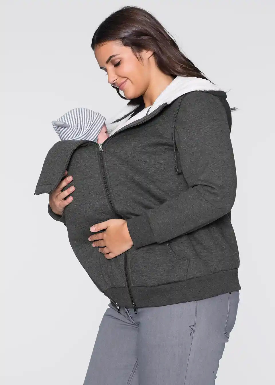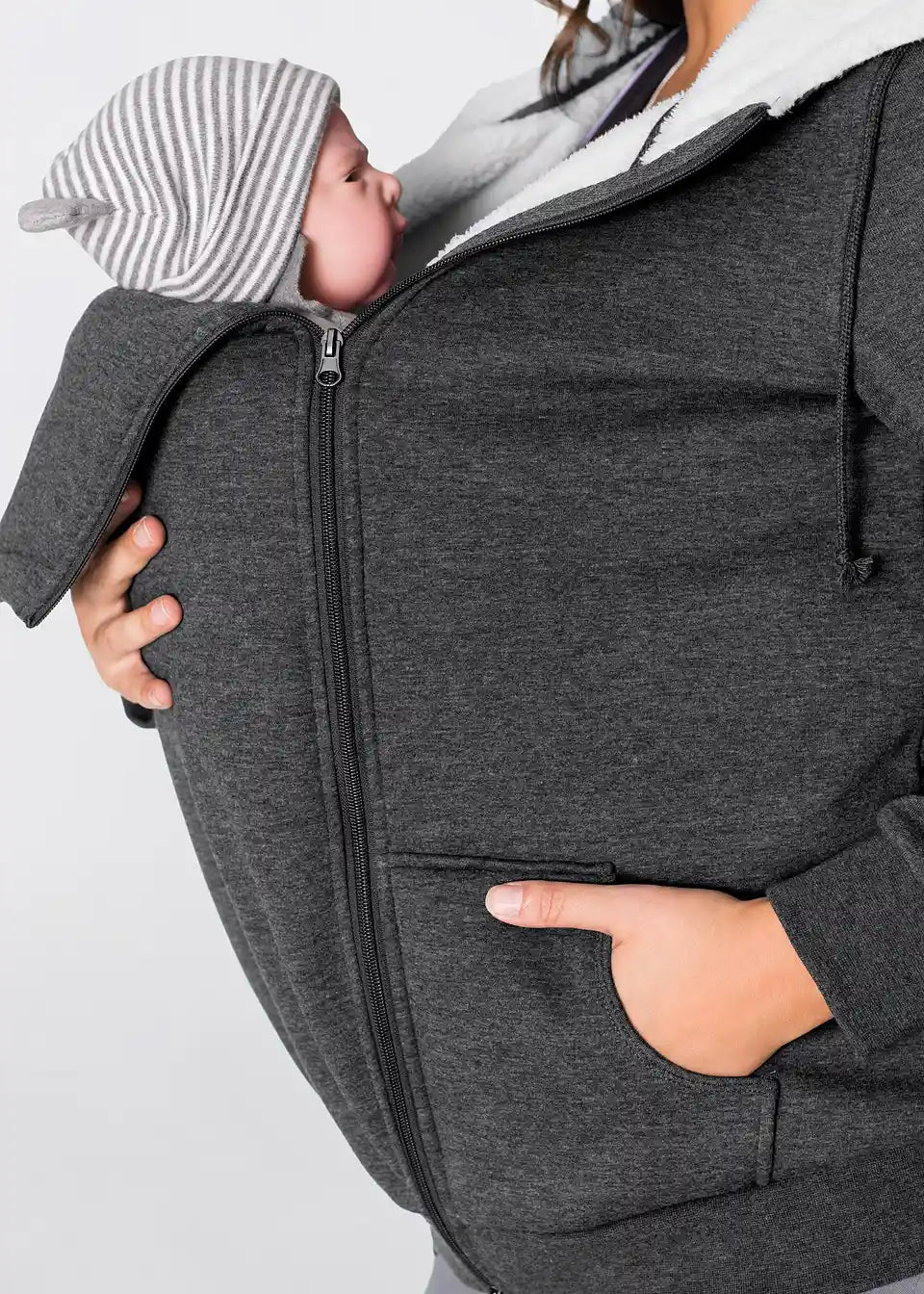 Udobna trudnička sweat jakna za hladne dane. Umetak za bebu služi samo za zaštitu djeteta od vjetra i vremenskih uvjeta, a ne za funkciju nošenja!