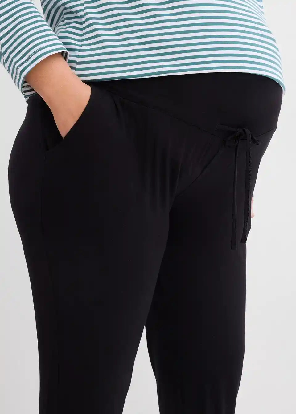 Hlače od certificirane viskoze s ravnim nogavicama i elastičnim rubom. Široki preklopni pojas osigurava udobno pristajanje tijekom i nakon trudnoće.