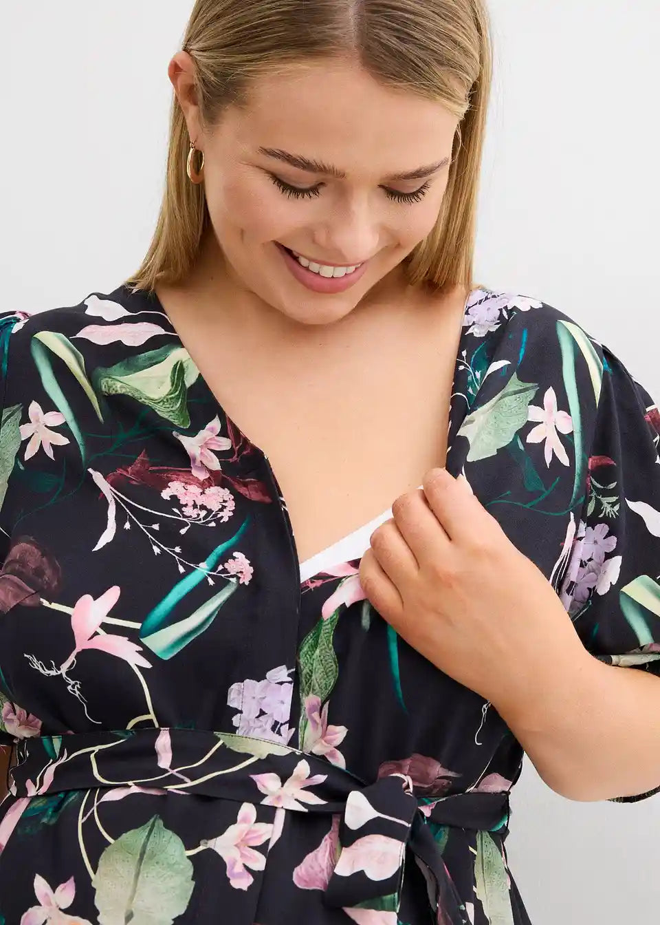Lepršava haljina od tkanine s V-izrezom i skrivenim, cijelim nizom gumba koji omogućuju udobno dojenje i jednostavno oblačenje i svlačenje. Uklonjivi pojas za vezanje ispod grudi osigurava prilagodljivo pristajanje, dok lagani balon-rukavi daju haljini moderan izgled.