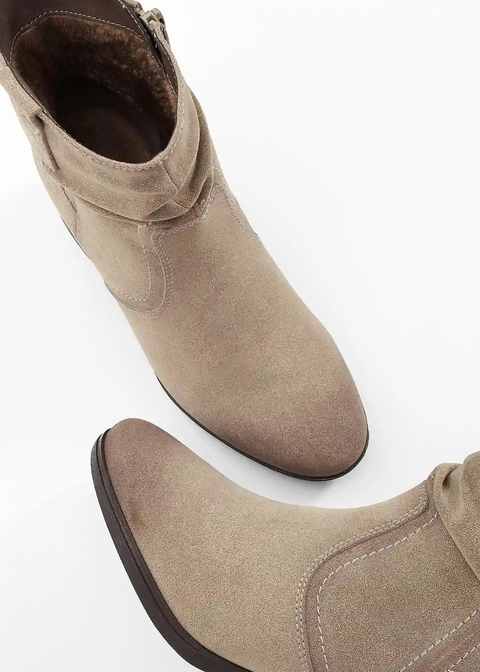 Ist halt Velourimitat und wird schnell dreckig. Auf keinen Fall ist es eine H-Weite, maximal eine G-Weite (sonst wäre ich nicht hineingekommen). Am Fuß chic aussehen tun sie aber. Für H-Füße jedoch nicht passend.