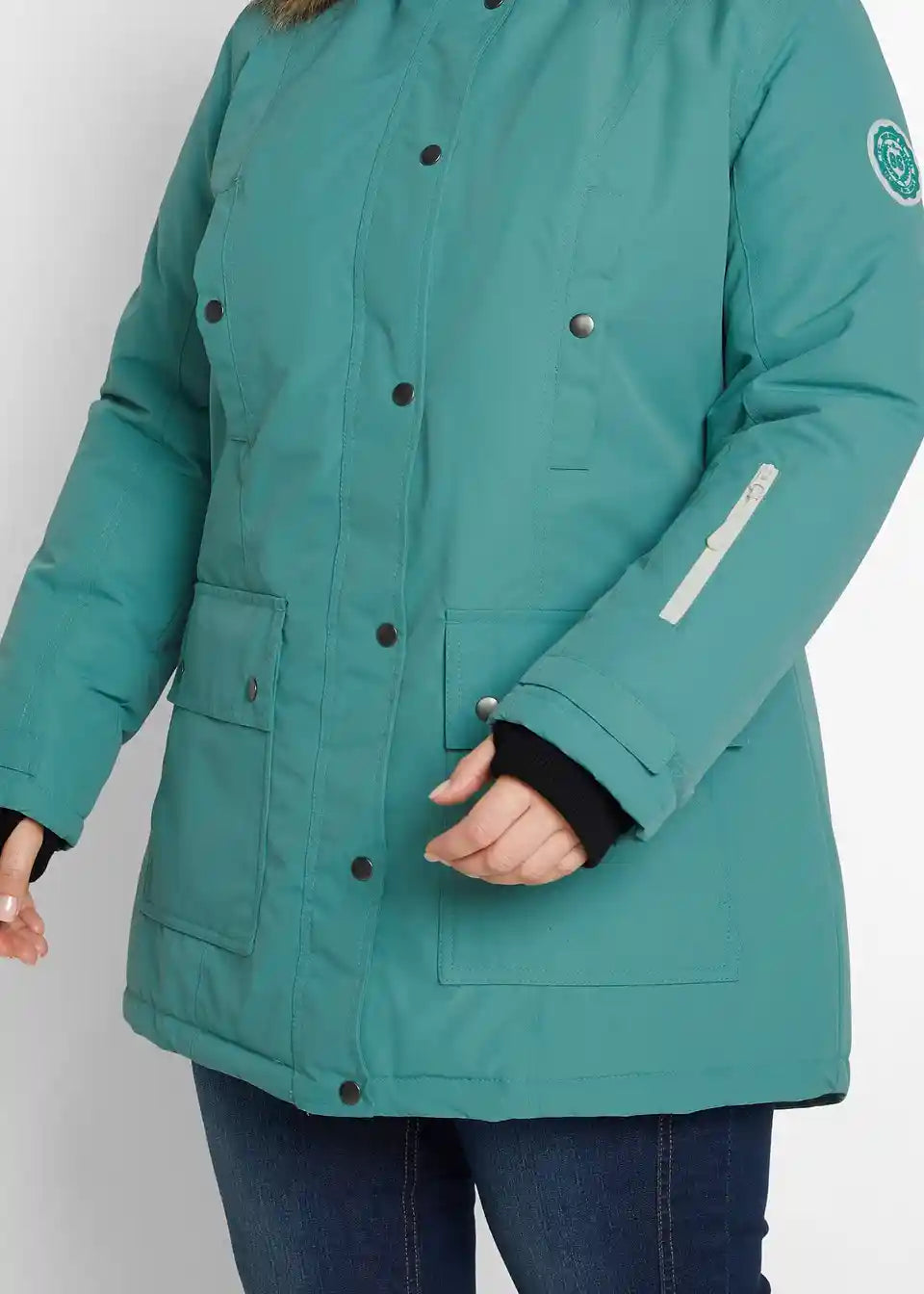 2-smjerni patentni zatvarač s zaštitom za bradu, kapuljača i krzno su odvojivi, unutarnji džep s kabelskim otvaranjem, otvori za palčeve, prugasta unutarnja podstava, duljina u veličini 42 približno 86 cm.