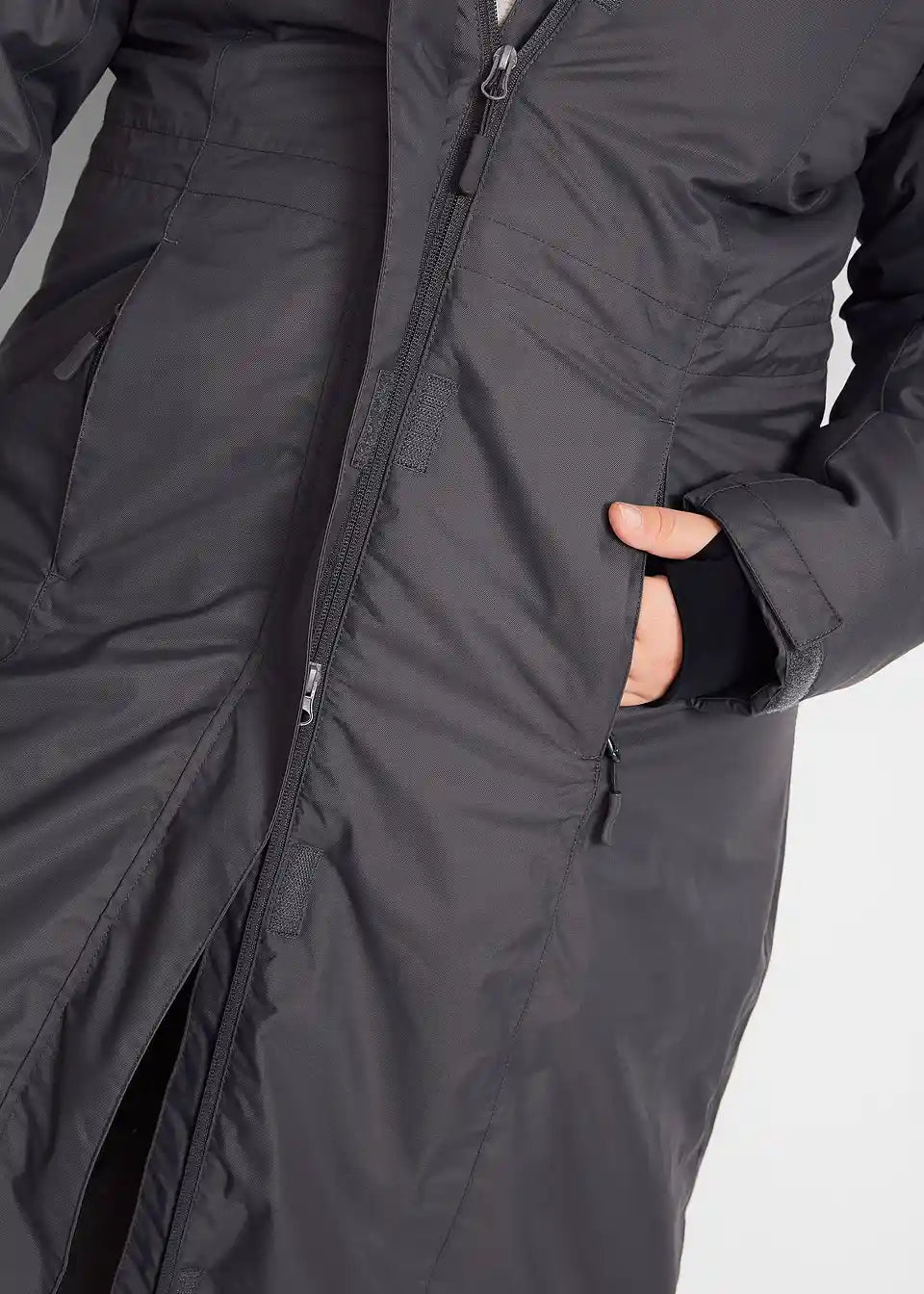 Unutrašnji džep s kablovskom funkcijom, krzno i kapuljača su odvojivi, otvori za palce, dvosmjerni zatvarač sa zaštitom za bradu, podesivi struk, vodeni stup 3000 mm, duljina u veličini 42 cca 120 cm.