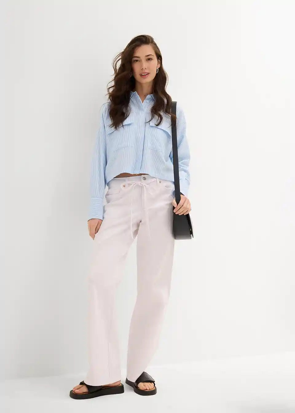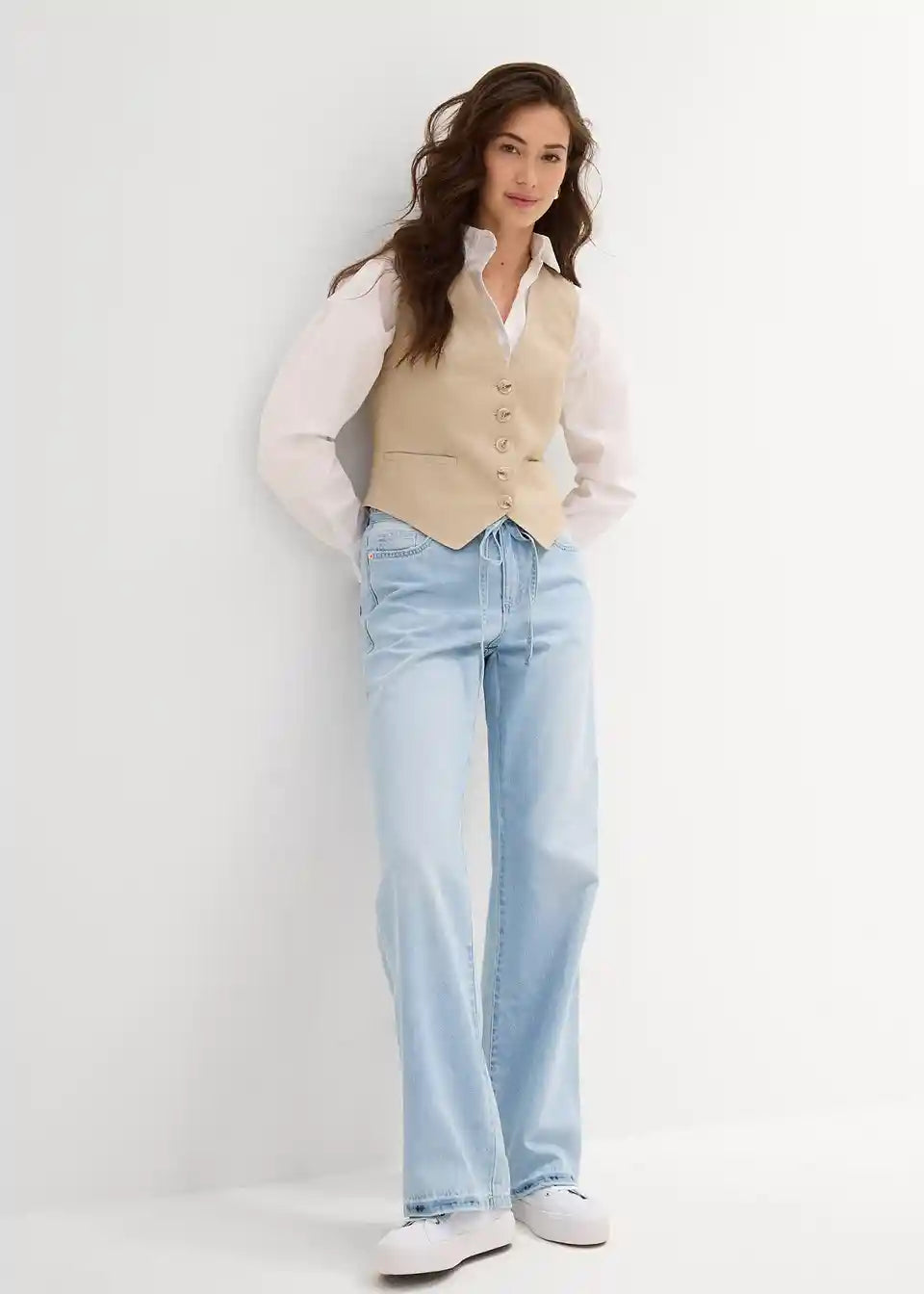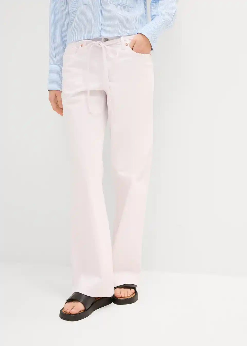 Svijetloplave 5-pocket traperice od izuzetno laganog denima s malom količinom rastezljivosti. Bijele 5-pocket traperice od rastezljivog denima. Unutarnja duljina nogavice u veličini 42 cca 80,5 cm, perive u perilici rublja.