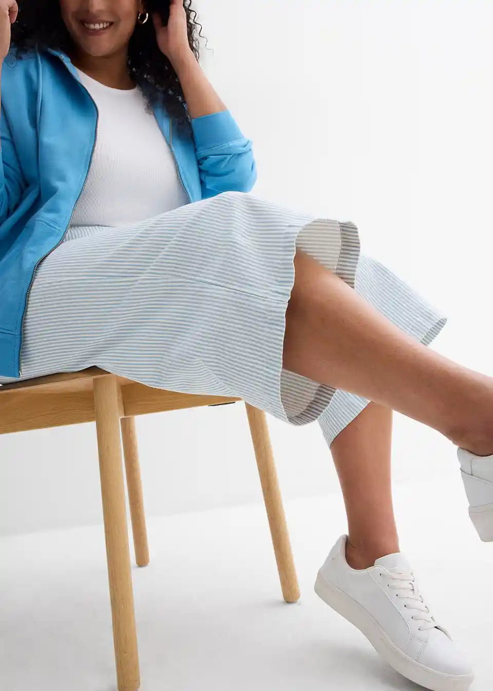 Značajka kroja:pruži komfor, olakšava kretanje zbog rastezljivog umetka, pruži udobnost zbog stretcha, vitak izgled zbog unaprijed pomaknutih šavova, sakrije puniji trbuh, stražnjicu, šire bokove i bedra, s kopčanjem sprijeda