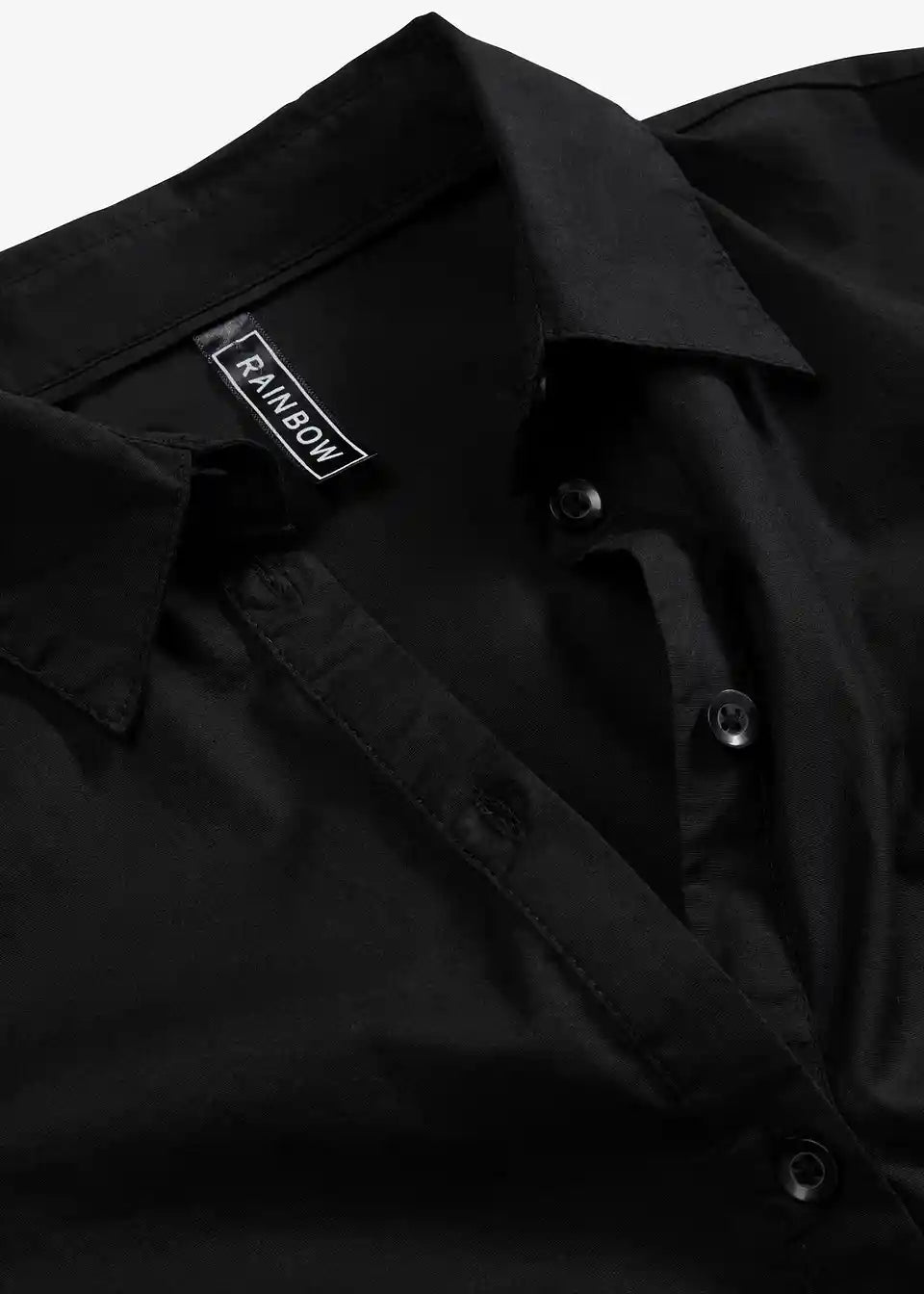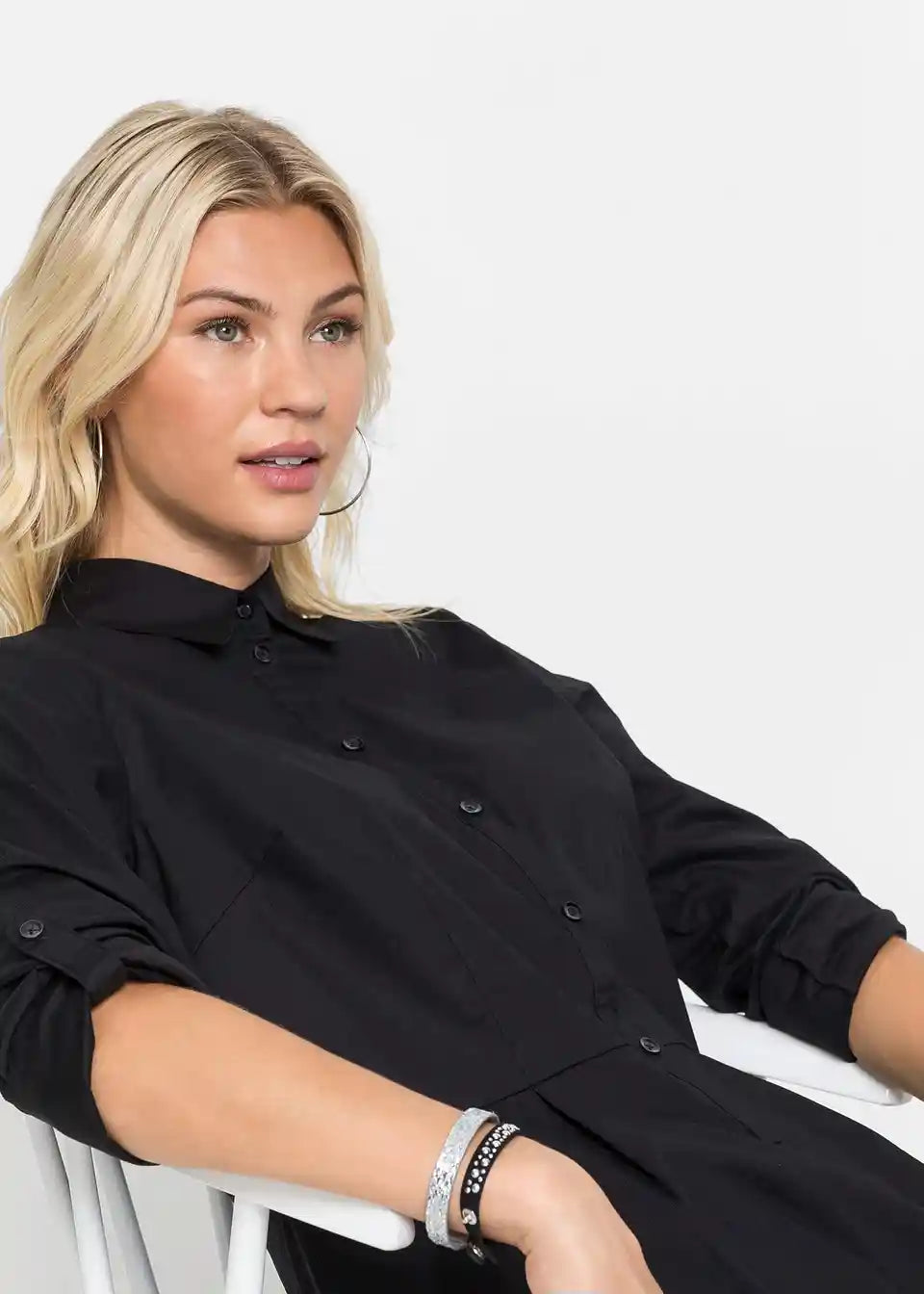 Ova trendi duga bluza stavlja se u iznimno dobar fokus. Impresivan dizajn ističe se širokom A-linijom. Zahvaljujući volanu s dužim stražnjim dijelom, nastaje privlačan izgled u Vokuhila stilu. Posebno moderan dojam ostavlja ovratnik na košulji. Široki manžetni rukavi mogu se opušteno zavrnuti i pričvrstiti ukrasnim trakama. Kopčanje na gumbe u prednjem središnjem dijelu proteže se do struka i čini elegantan završetak.