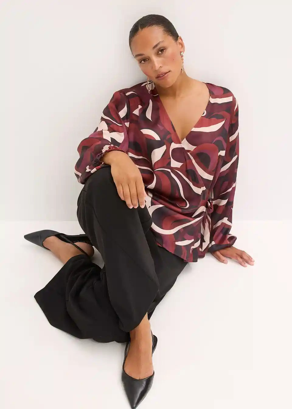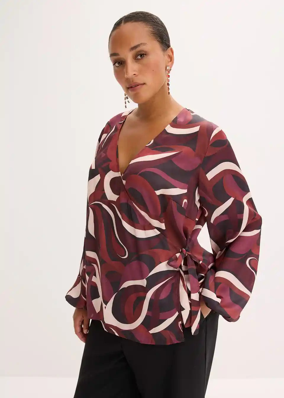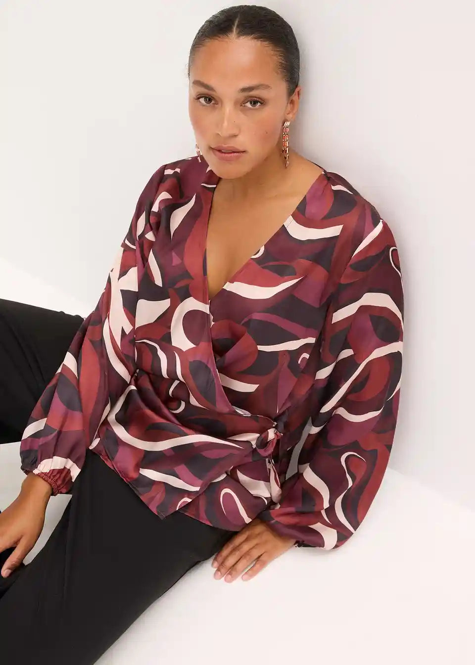 Moderno printana omotana bluza od lepršavog satena s vezicom za vezanje iznutra i izvana