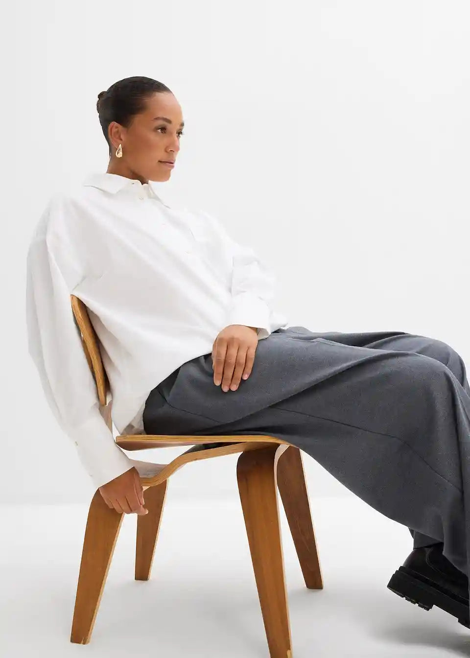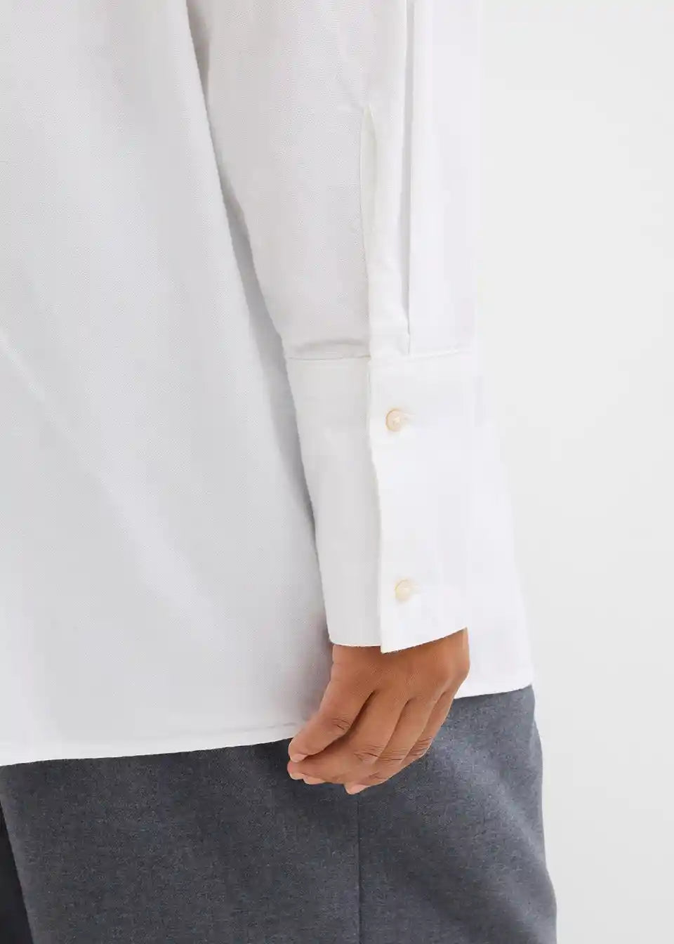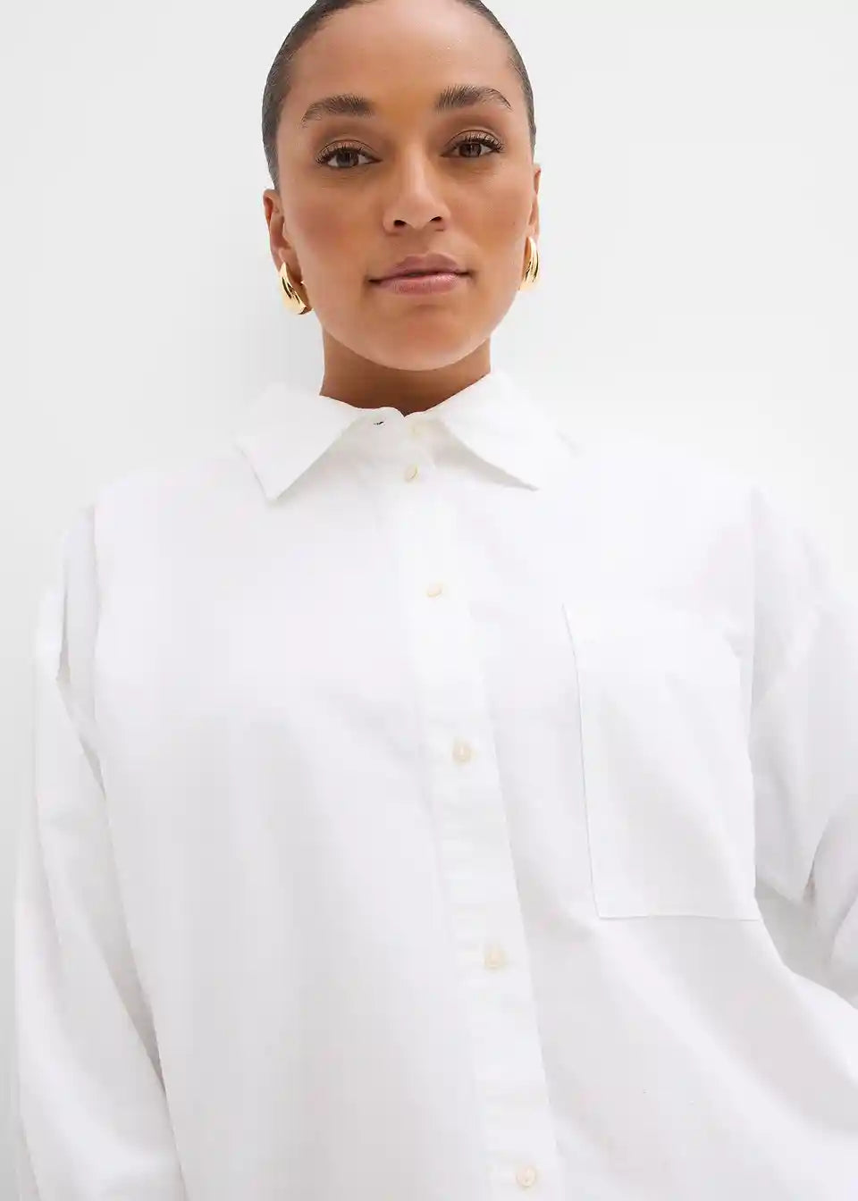 Oversized bluza od čvrstog Oxford organskog pamuka s ovratnikom, prednjim gumbima i otvorenim džepom na prsima. Dugi rukavi s dugim manžetama na kopčanje.