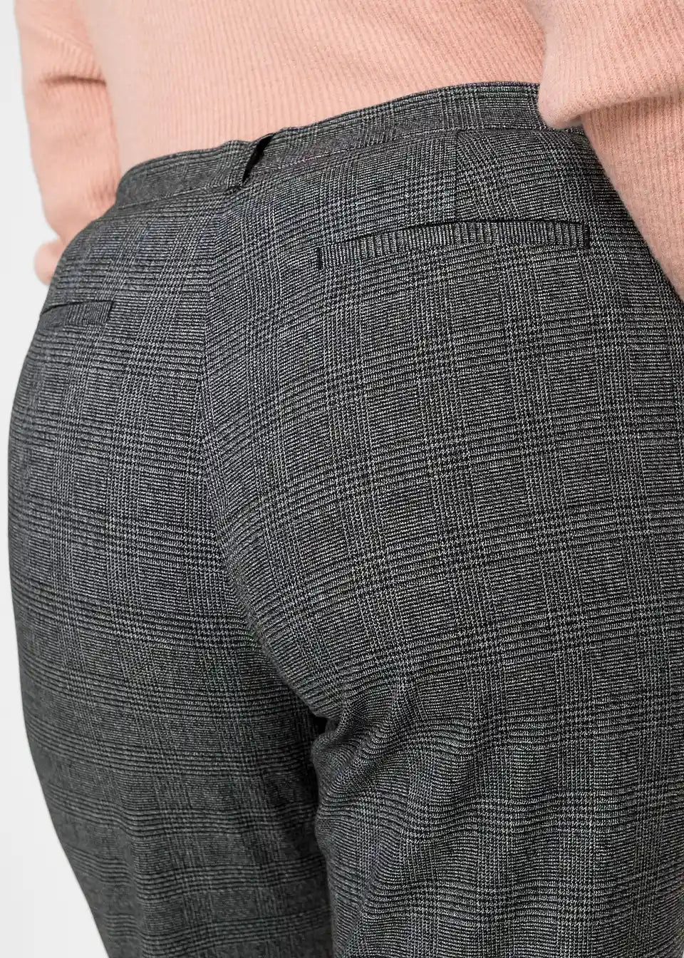 Hlače s kariranim uzorkom s dva bočna džepa i "lažnim džepovima" na stražnjoj strani. Hlače se zatvaraju patentnim zatvaračem i gumbom. Unutarnja dužina nogavice u veličini 38 cca 71,5 cm.