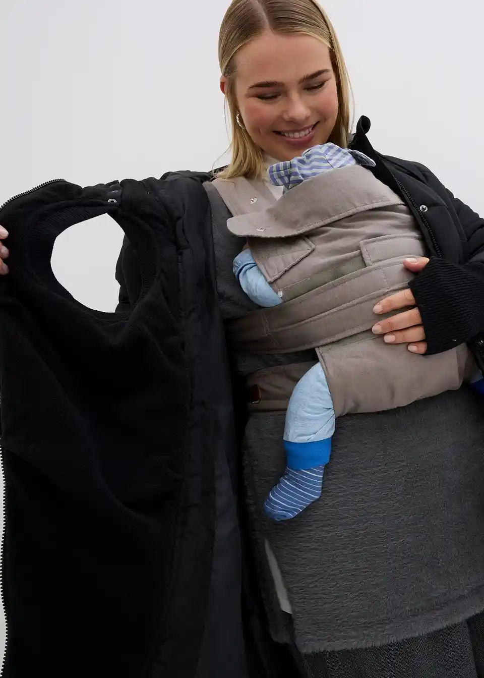Vodootporna i vjetrootporna trudnička jakna s umetkom za nošenje. Umetak je ugodno podstavljen flisom i opremljen malom kapuljačom. S kapuljačom s vezicom i prednjim džepovima. Bočni patentni zatvarači omogućuju regulaciju širine, osiguravajući nošenje i tijekom trudnoće i nakon nje. Dugi, mekani rebrasti rukavi s otvorom za palac sprječavaju ulazak hladnoće i vjetra.