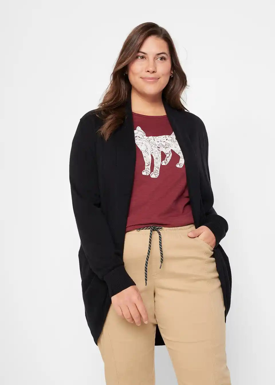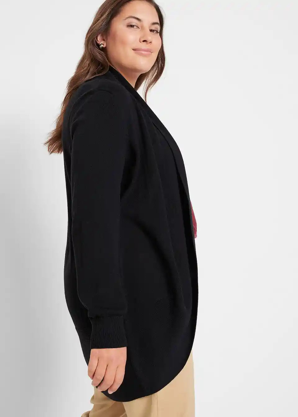 Ova ležerna pletena jakna iz aktualne kolekcije bpc impresionira visokim udobnostima nošenja i posebnim krojem: udobna jakna ima duge rukave s finim rebrastim manžetama i zaobljenim rubom. Nosite ju otvorenu i najbolje se kombinira s uskim majicama, topovima i uskim hlačama.