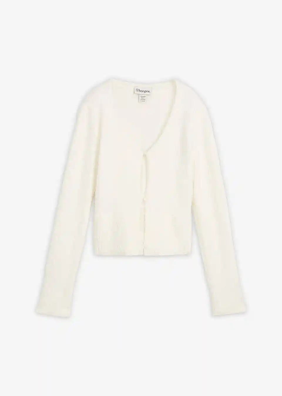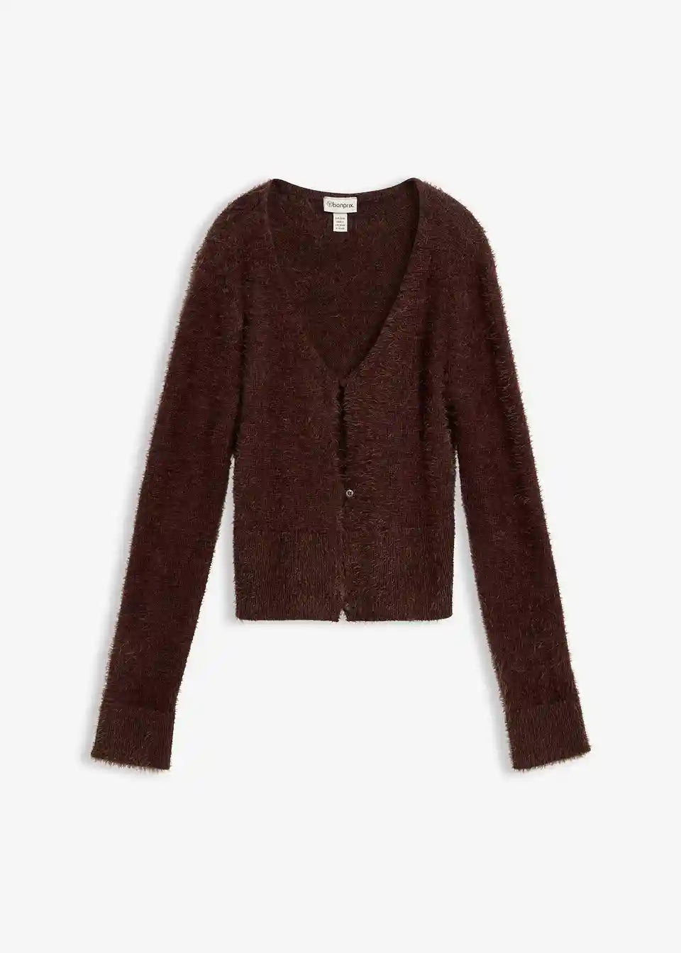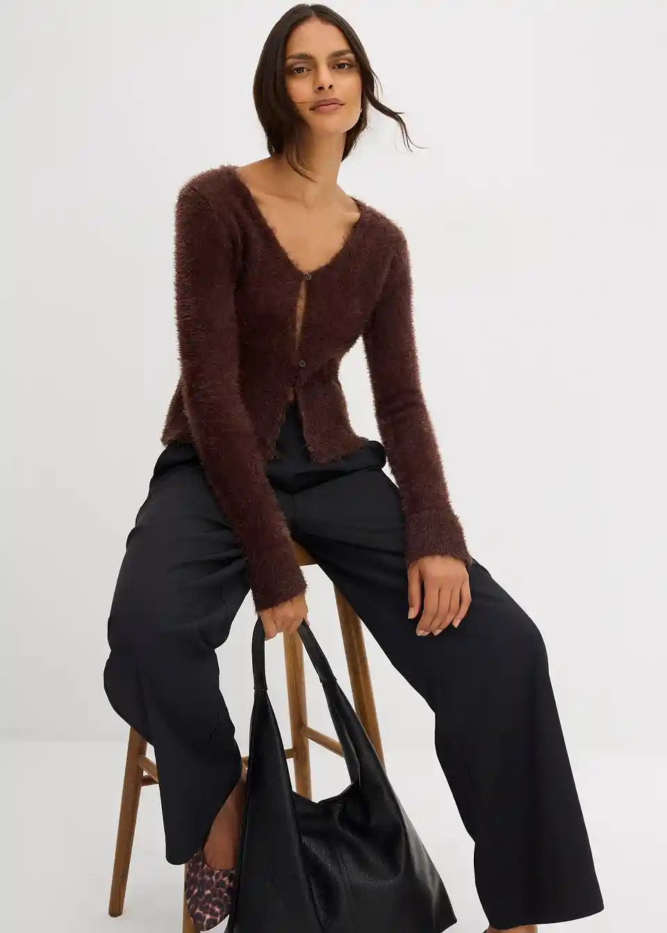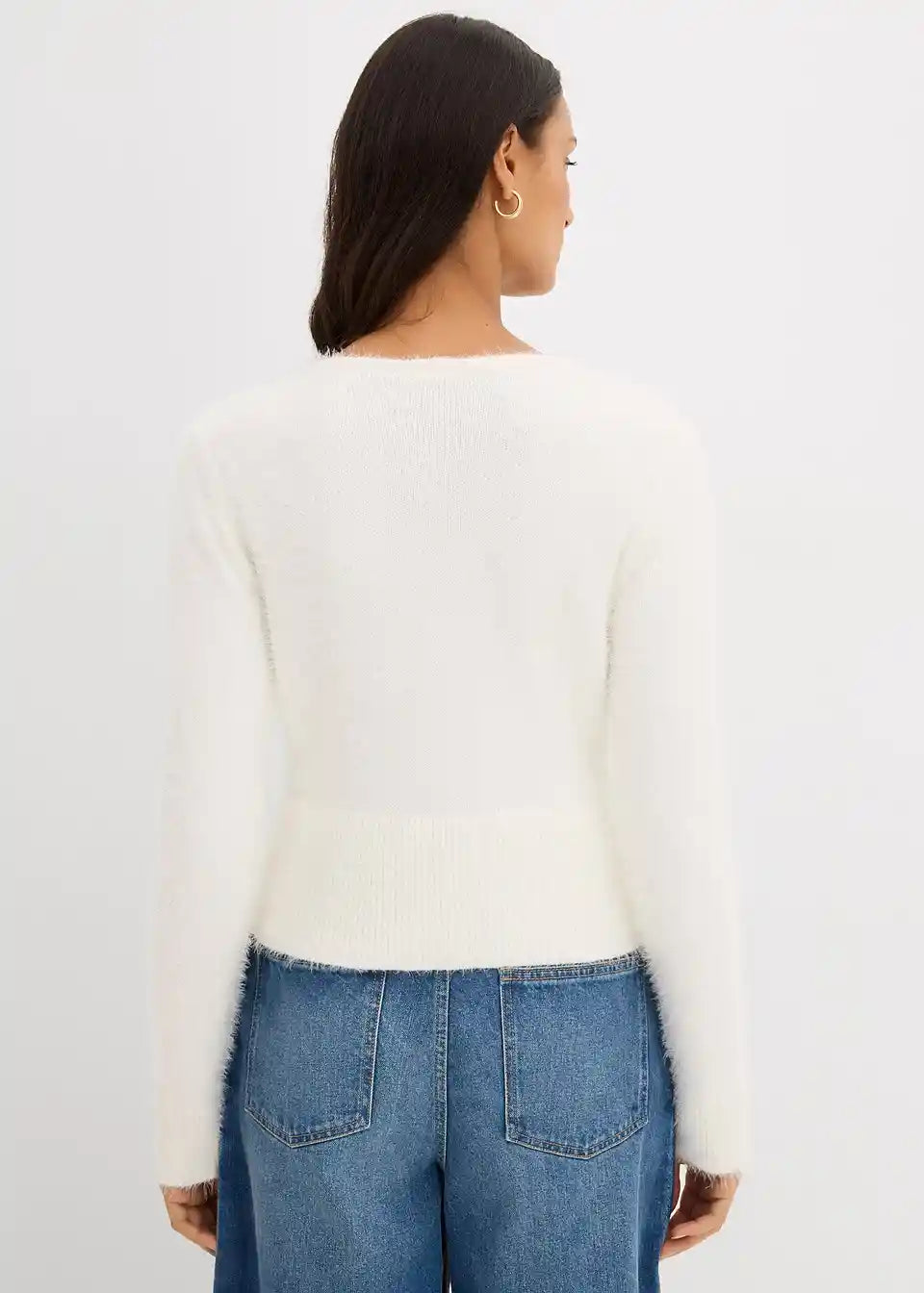 Moderna fina pletena jakna od perjastog prediva s dubokim izrezom