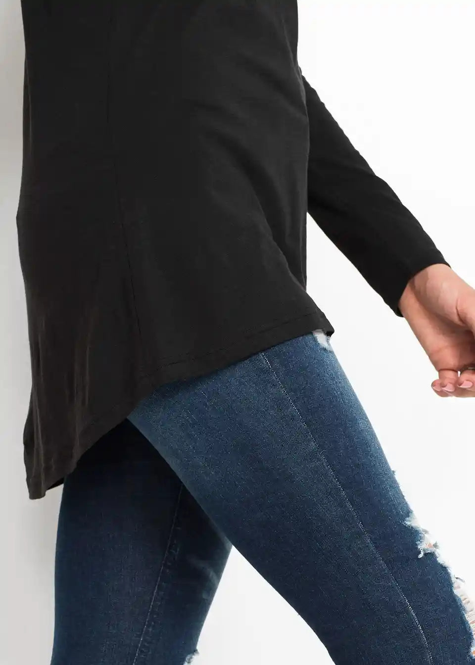 Posebnu ležernost daje ovoj laganoj majici u O-kroju s kapuljačom. Trendovski detalji su veliki V-izrez u obliku srca te biza i paspuliranje na rubu. Stražnji dio s zaobljenim rubom je nešto duži od prednjeg. Model diskretnog izgleda odlično se kombinira s uskim donjim dijelovima, ali izgleda super i kao stylish mini haljina.