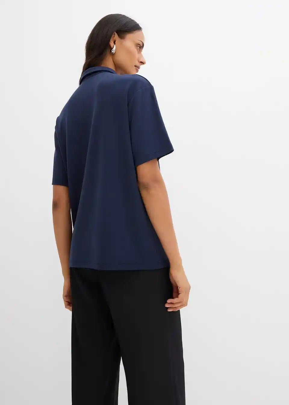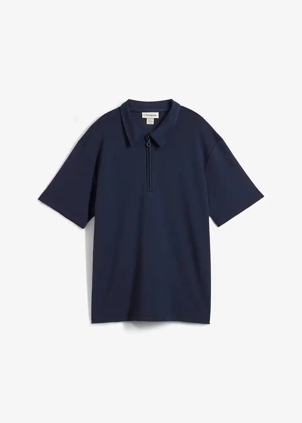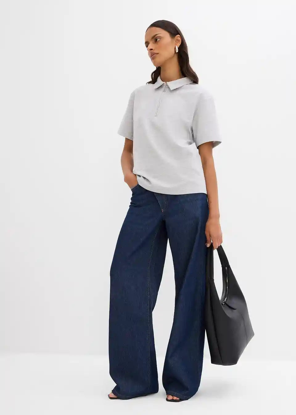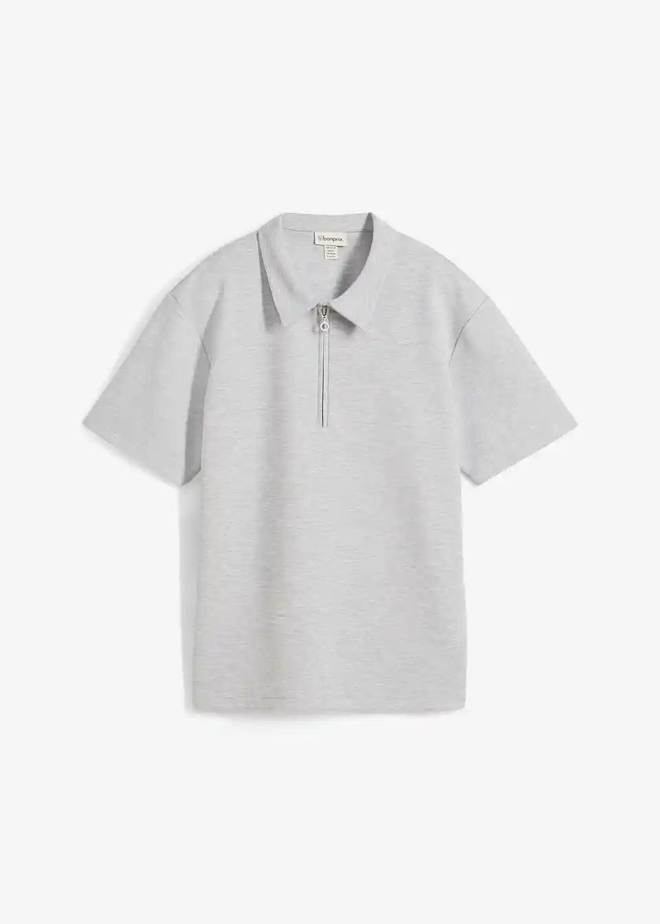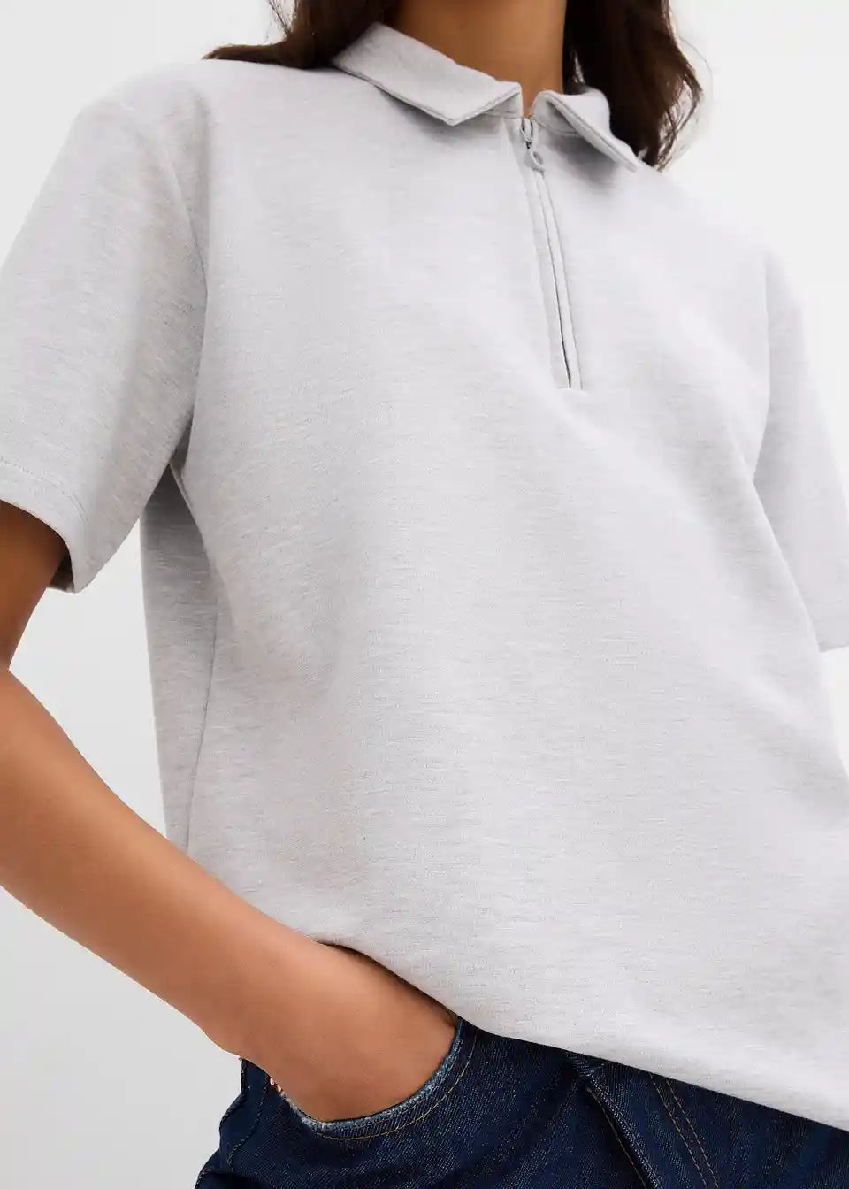 Poloshirt s polo ovratnikom, kratkim patentnim zatvaračem sprijeda, lagano spuštenim ramenima, kratkim rukavima i ravnim rubom.