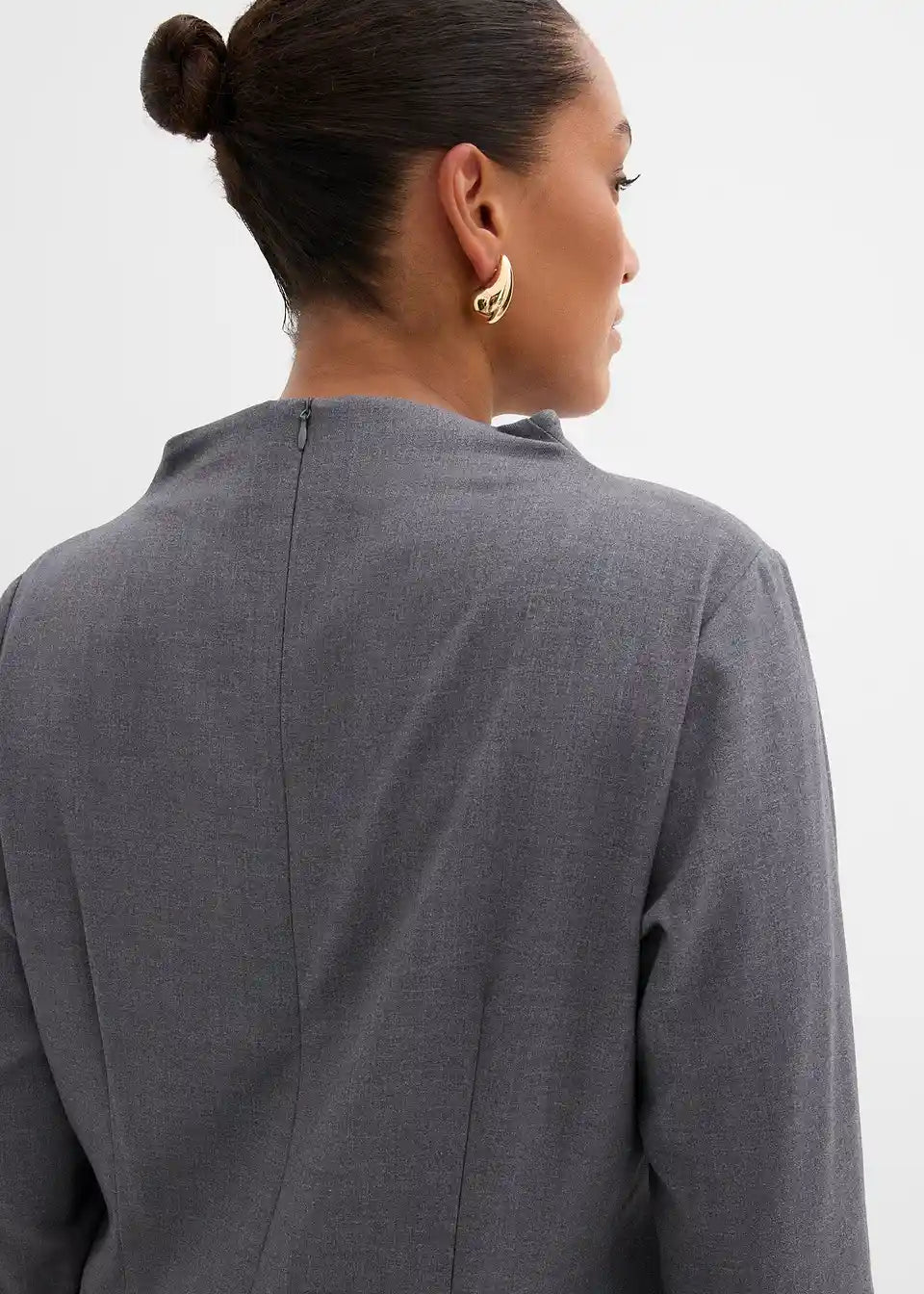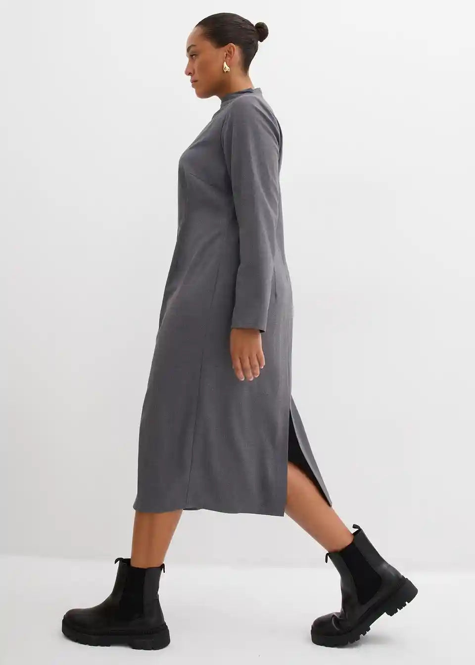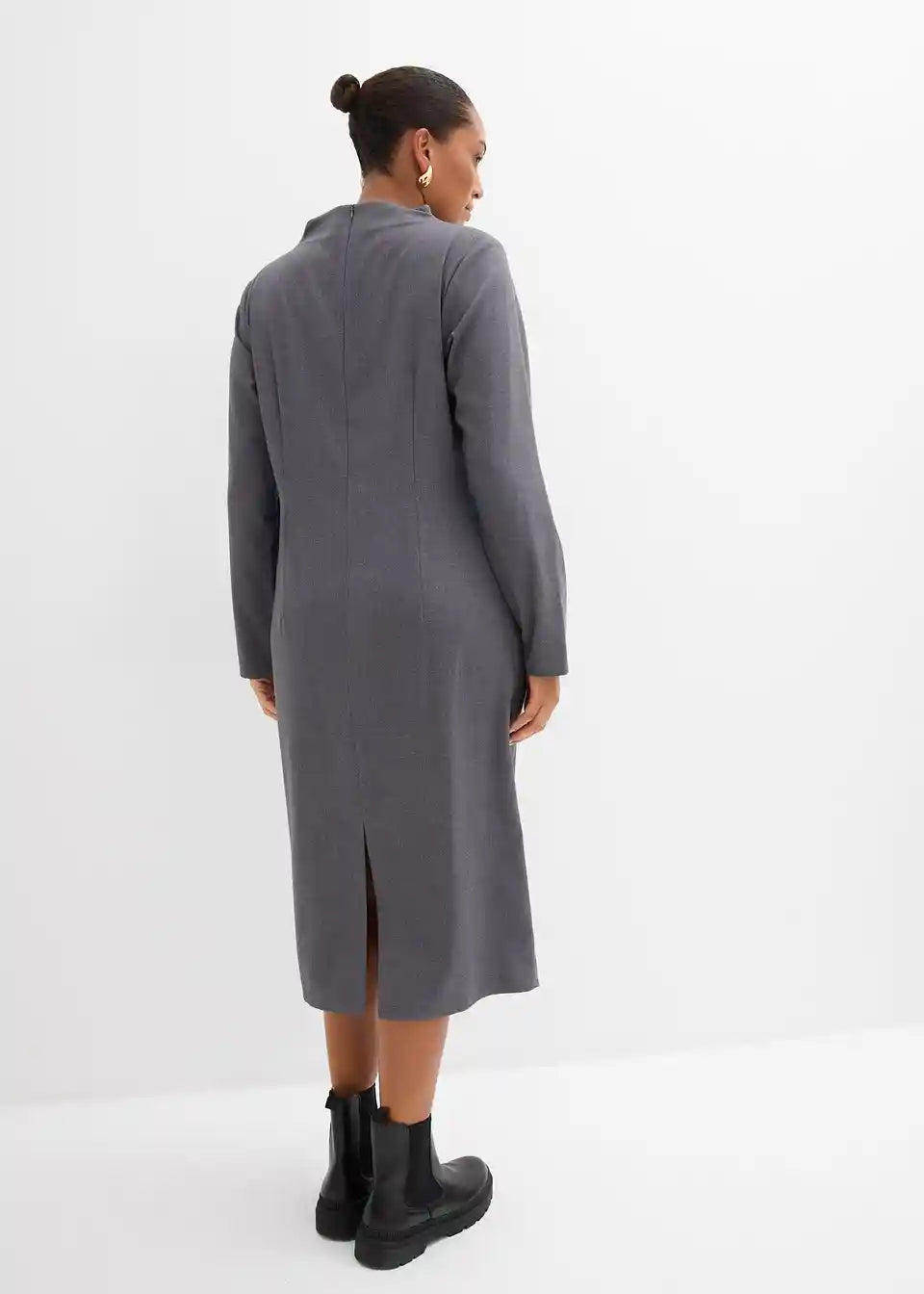 Visoko zatvorena midihaljina s pregibima i podjeljenim šavovima sprijeda i straga te otvorom s patentnim zatvaračem na leđima
