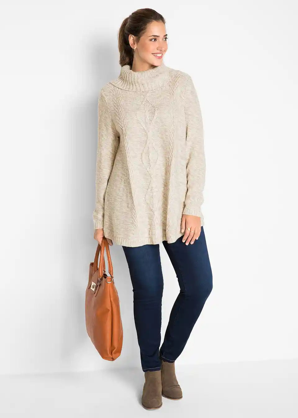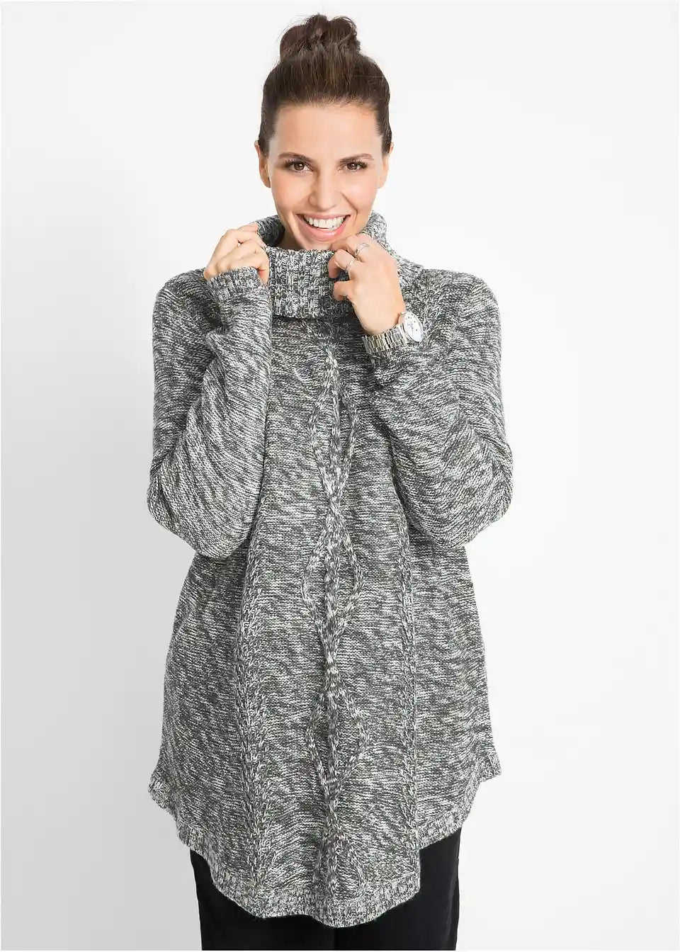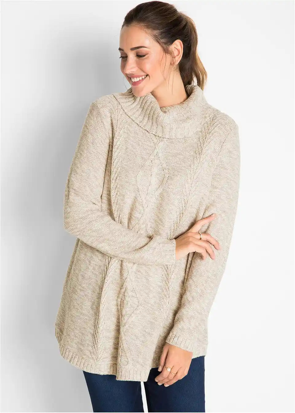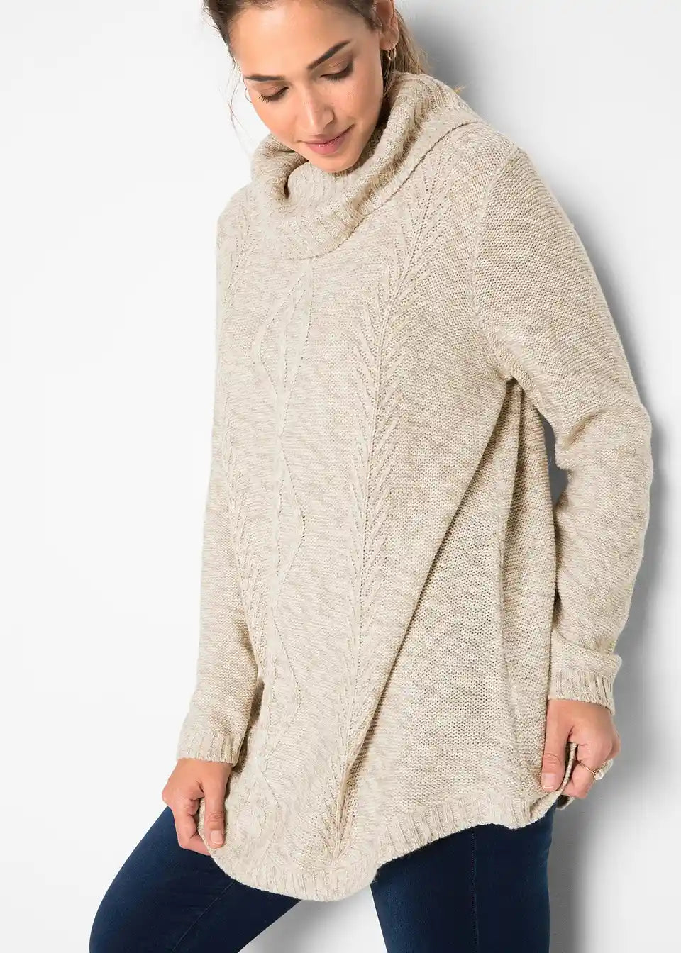 Dugi pulover iz trenutne kolekcije bpc-a oduševljava modernim A-krojem: Mekani pulover je sprijeda i straga šiljat te ima široki rol ovratnik. Udobni pončo-pulover ukrašen je privlačnim pletenim uzorkom i najbolje se kombinira s uskim hlačama i zimskim čizmama.