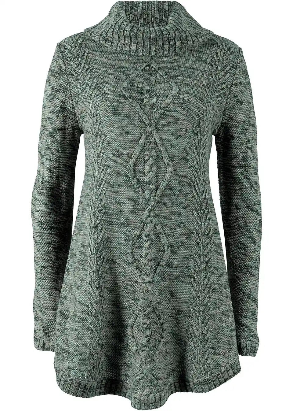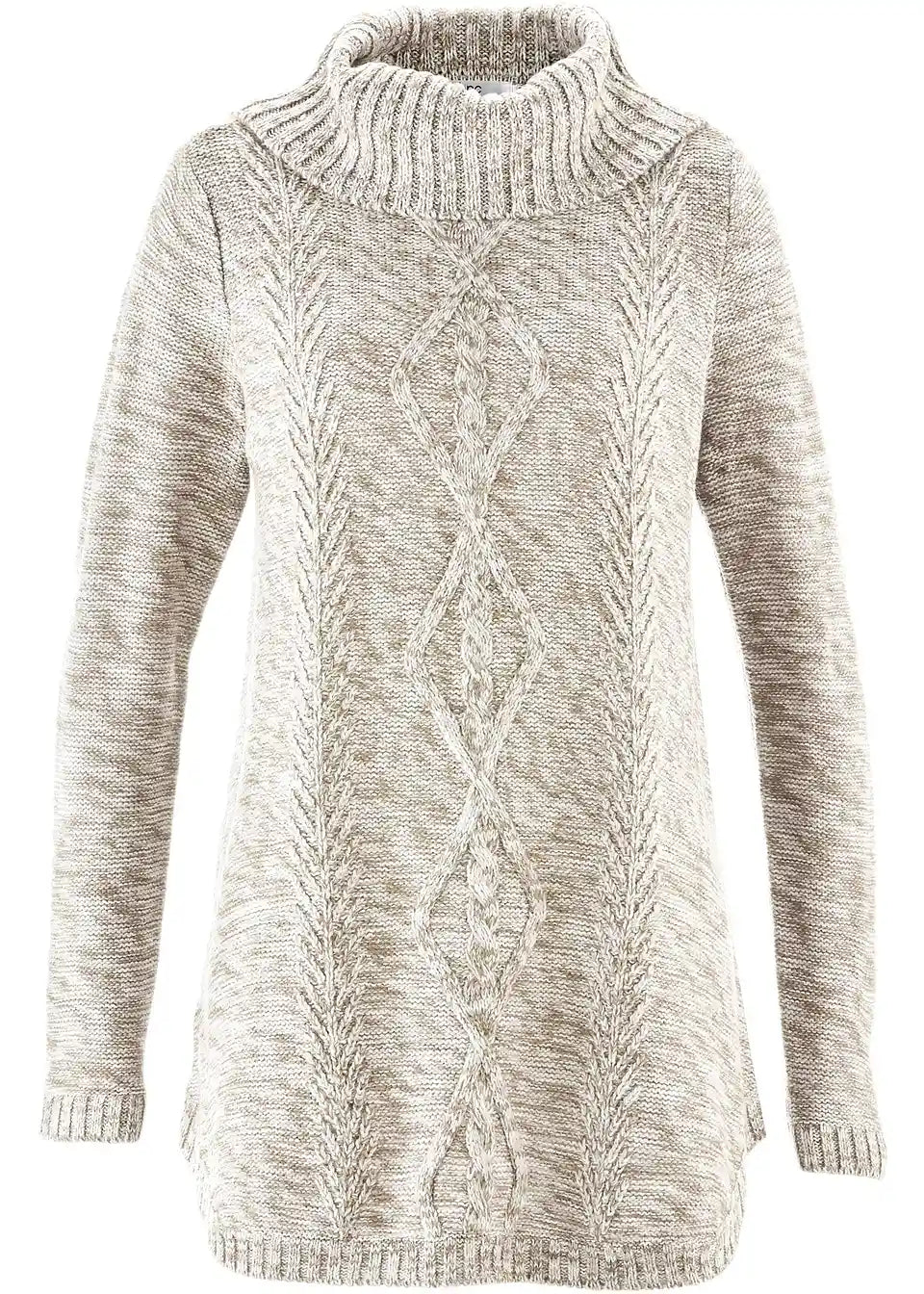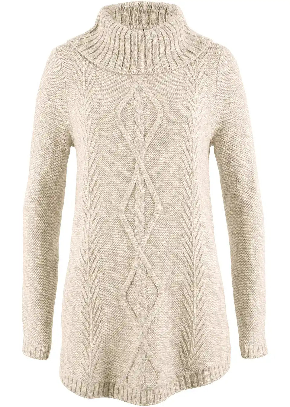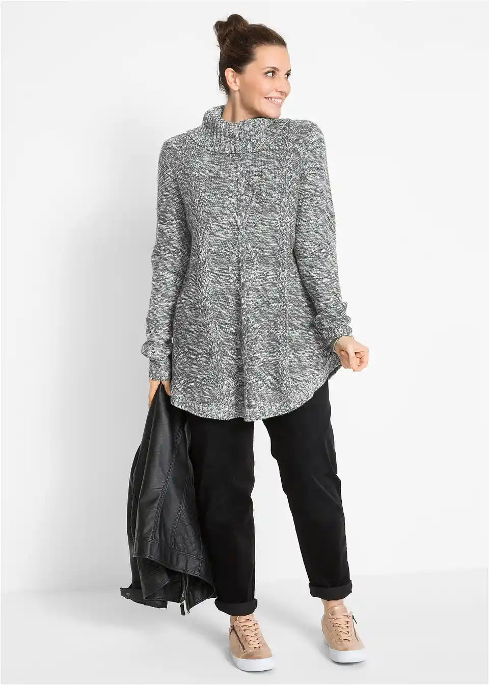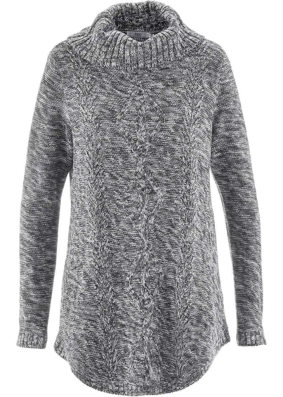 Dugi pulover iz trenutne kolekcije bpc-a oduševljava modernim A-krojem: Mekani pulover je sprijeda i straga šiljat te ima široki rol ovratnik. Udobni pončo-pulover ukrašen je privlačnim pletenim uzorkom i najbolje se kombinira s uskim hlačama i zimskim čizmama.