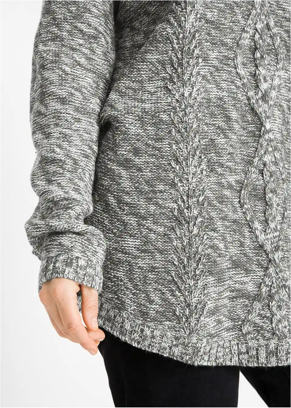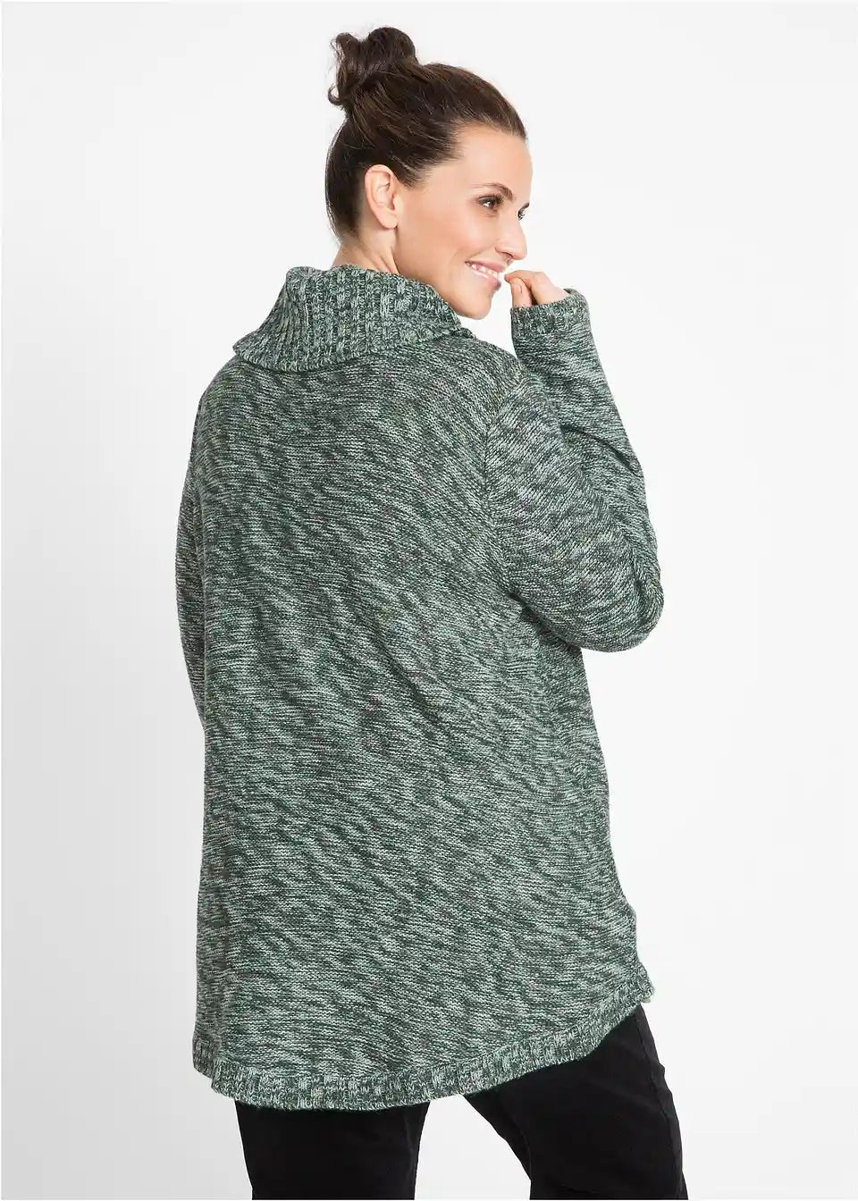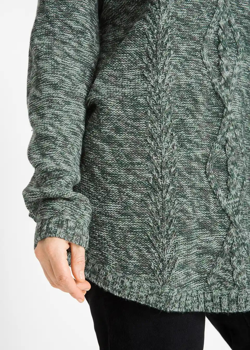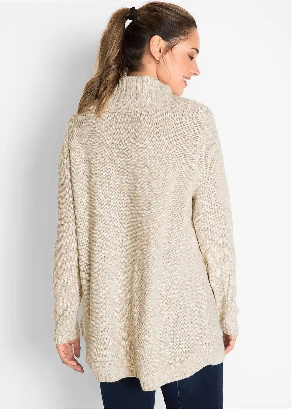Dugi pulover iz trenutne kolekcije bpc-a oduševljava modernim A-krojem: Mekani pulover je sprijeda i straga šiljat te ima široki rol ovratnik. Udobni pončo-pulover ukrašen je privlačnim pletenim uzorkom i najbolje se kombinira s uskim hlačama i zimskim čizmama.