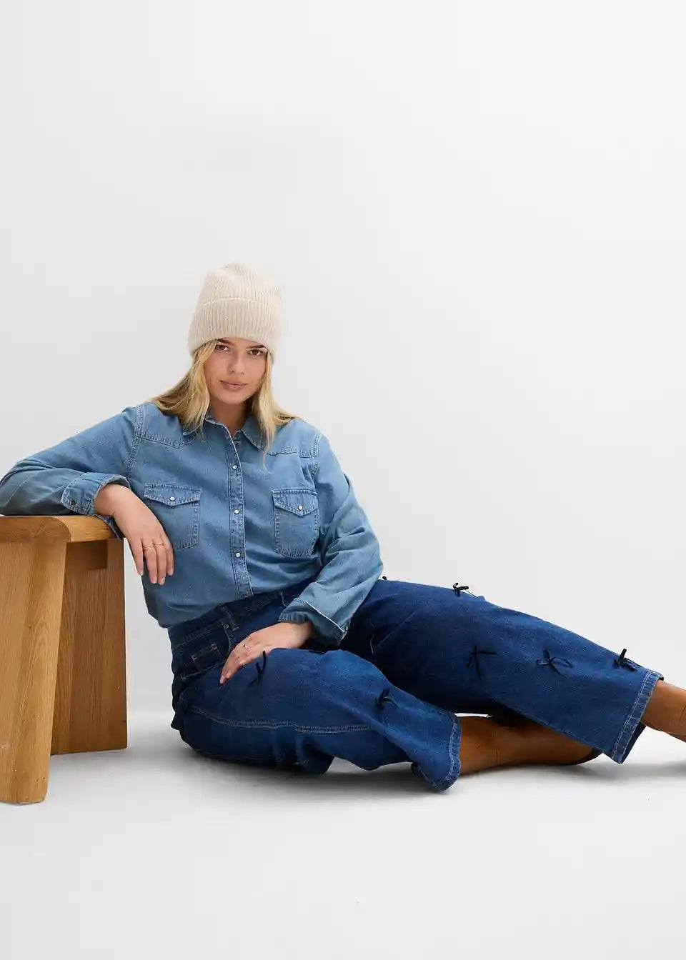 5-džepne traperice od denima. Ležerni kroj s voluminoznom, zaobljenom nogavicom od bokova do bedara i suženim krojem prema dolje. Visoki struk s udobnim pojasom i prišivenim mašnama.