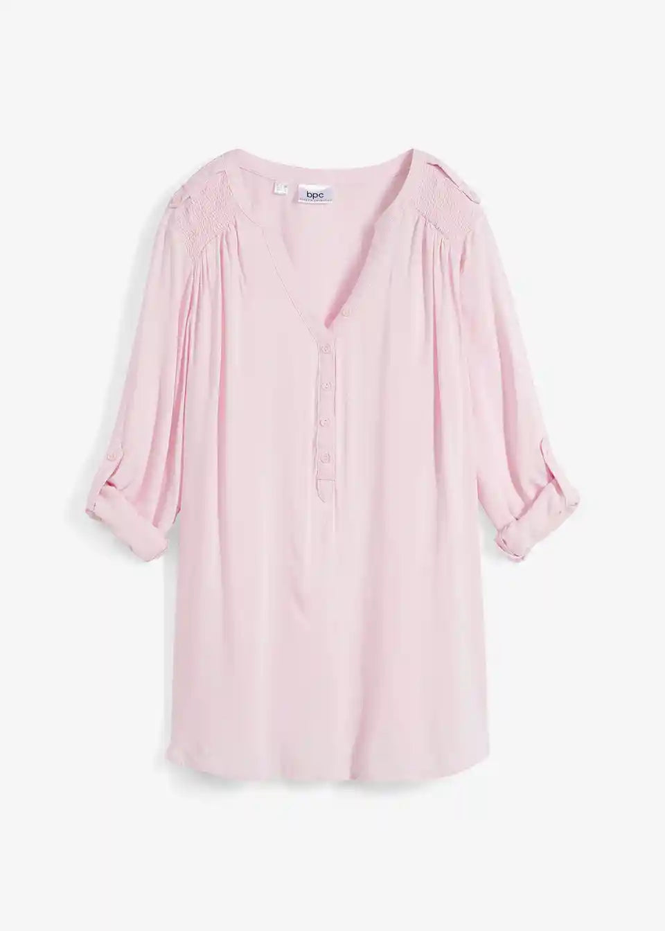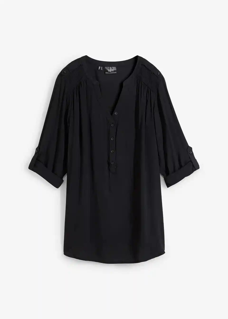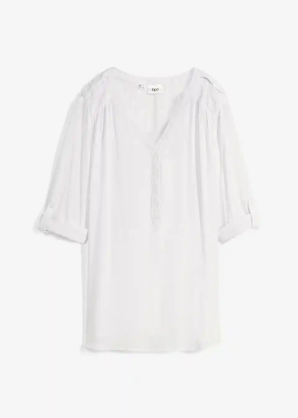 U ležernom izgledu ove sezone neizostavna je tunika bluza u kvaliteti košulje s dugim rukavima. Ovaj model oduševljava ležernim krojem i detaljima poput malih traka na rukavima za efekt podvrnutih rukava. Tunika bluza ima zaobljen rub i V-izrez na koji se nadovezuje mala dugmad. Bilo da je nosite casual uz traperice ili razigrano uz traper suknju i balerinke: Bluzu iz kolekcije bpc možete kombinirati na razne načine.