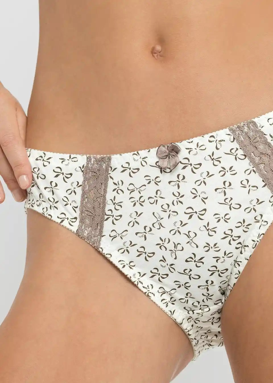 Ugodne na koži s diskretnim detaljima - ove gaćice nude visoku udobnost i privlačan dizajn. Vizualno model impresionira atraktivnim printom mašne i malom ukrasnom mašnom u odgovarajućoj boji sprijeda u sredini. Čipkasti rubovi u boji uzorka ukrašavaju prednji dio, a elastični pojas s detaljima sitnih zubaca dodaje male naglaske. Znojni umetak je izrađen od pamuka. U pakiranju više komada od bpc-a, gaćice dolaze u različitim nijansama boja.