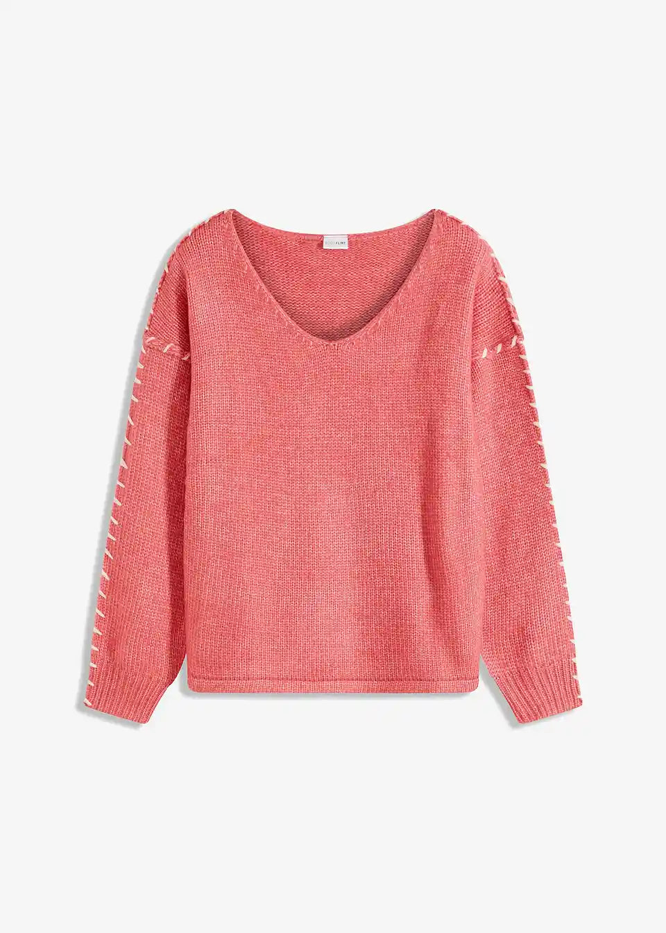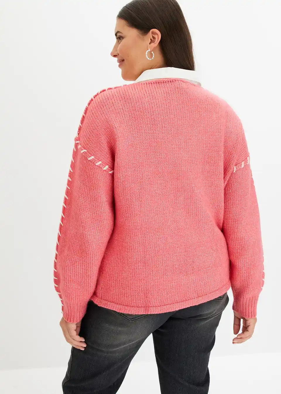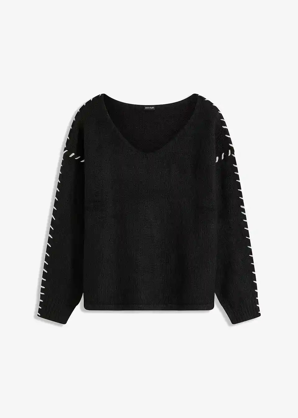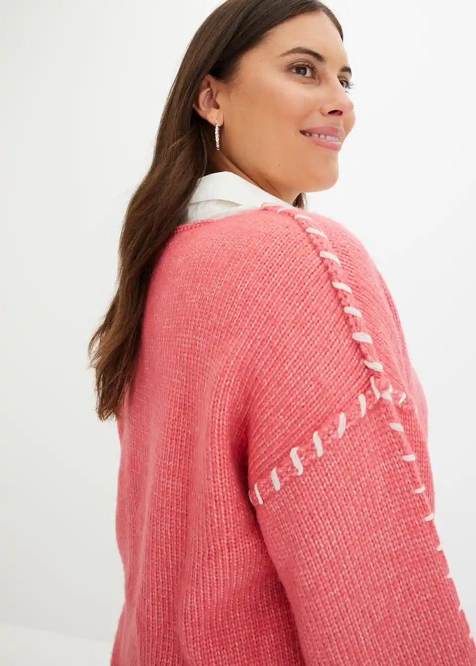 Mekani grubo pleteni pulover s izvezenim kontrastnim šavovima
