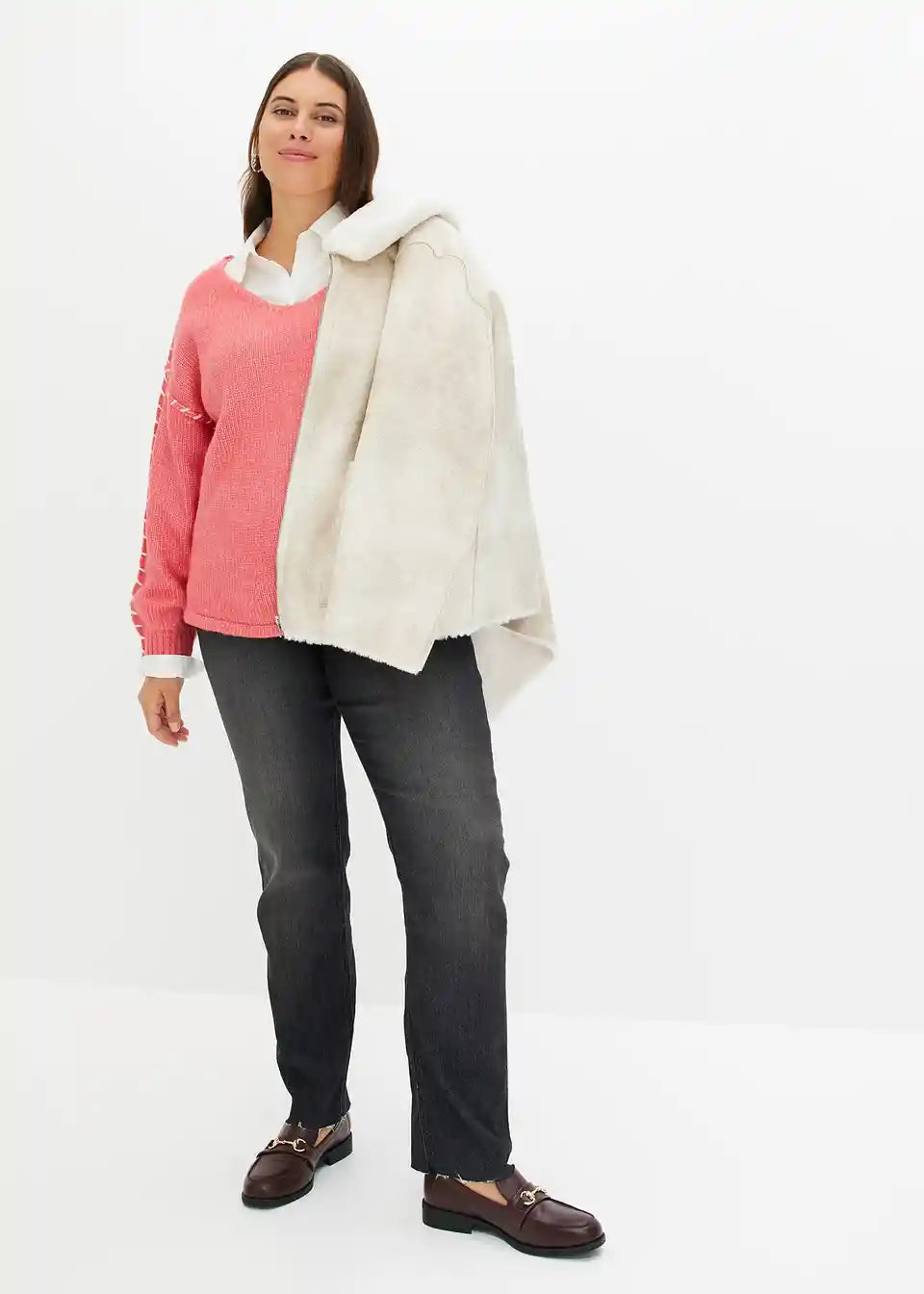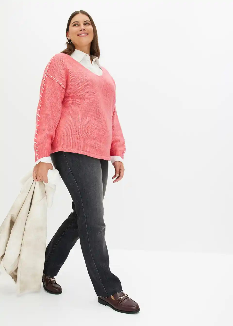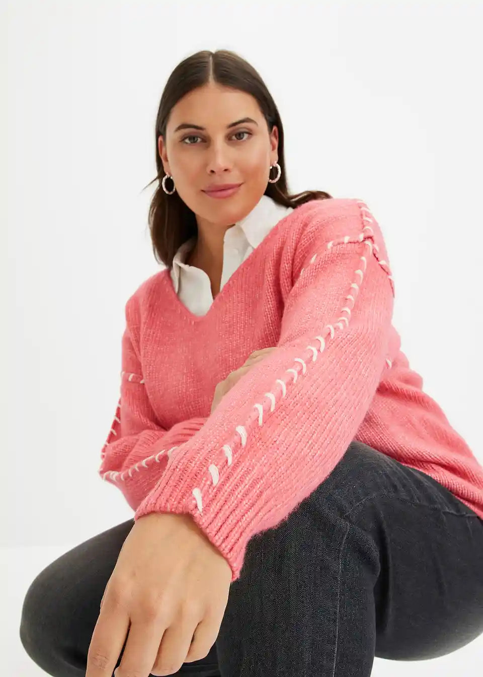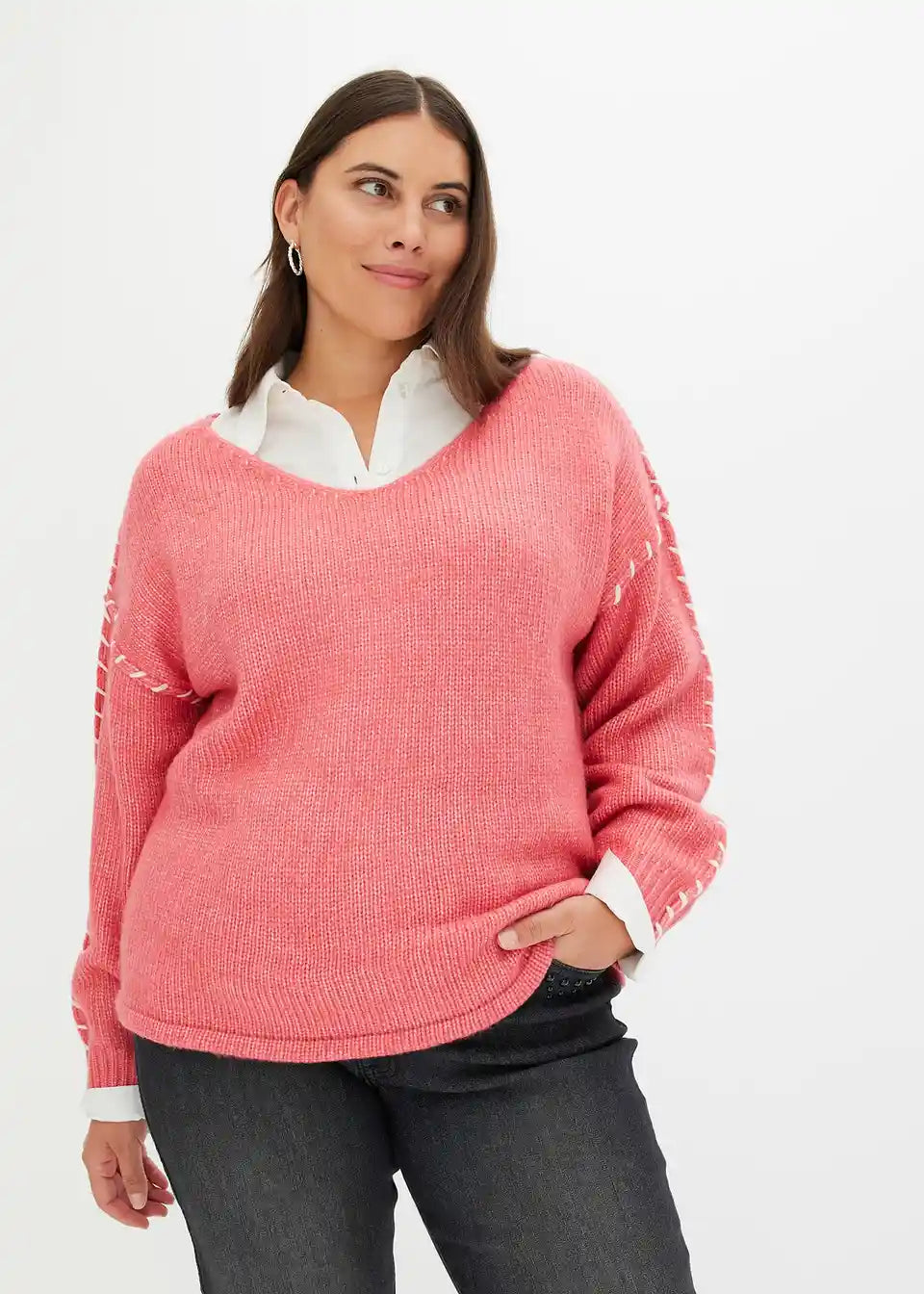 Mekani grubo pleteni pulover s izvezenim kontrastnim šavovima