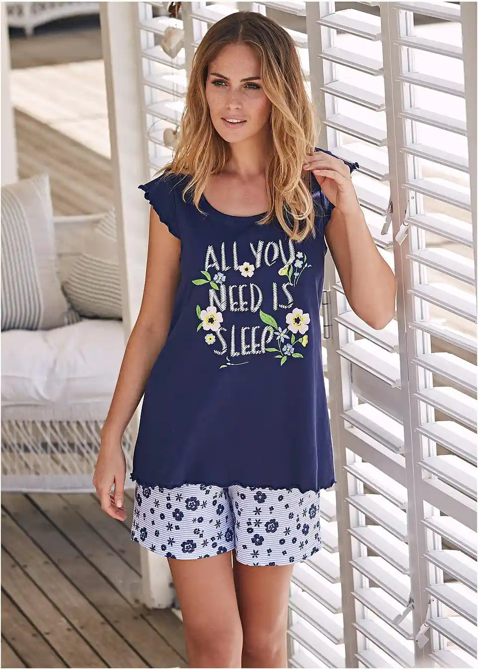 Mekana pidžama sastoji se od kratkih hlača s uzorkom i majice kratkih rukava s okruglim izrezom. Lepršavi A-kroj majice i lagani rukavići daju pidžama setu ženstveni izgled.
