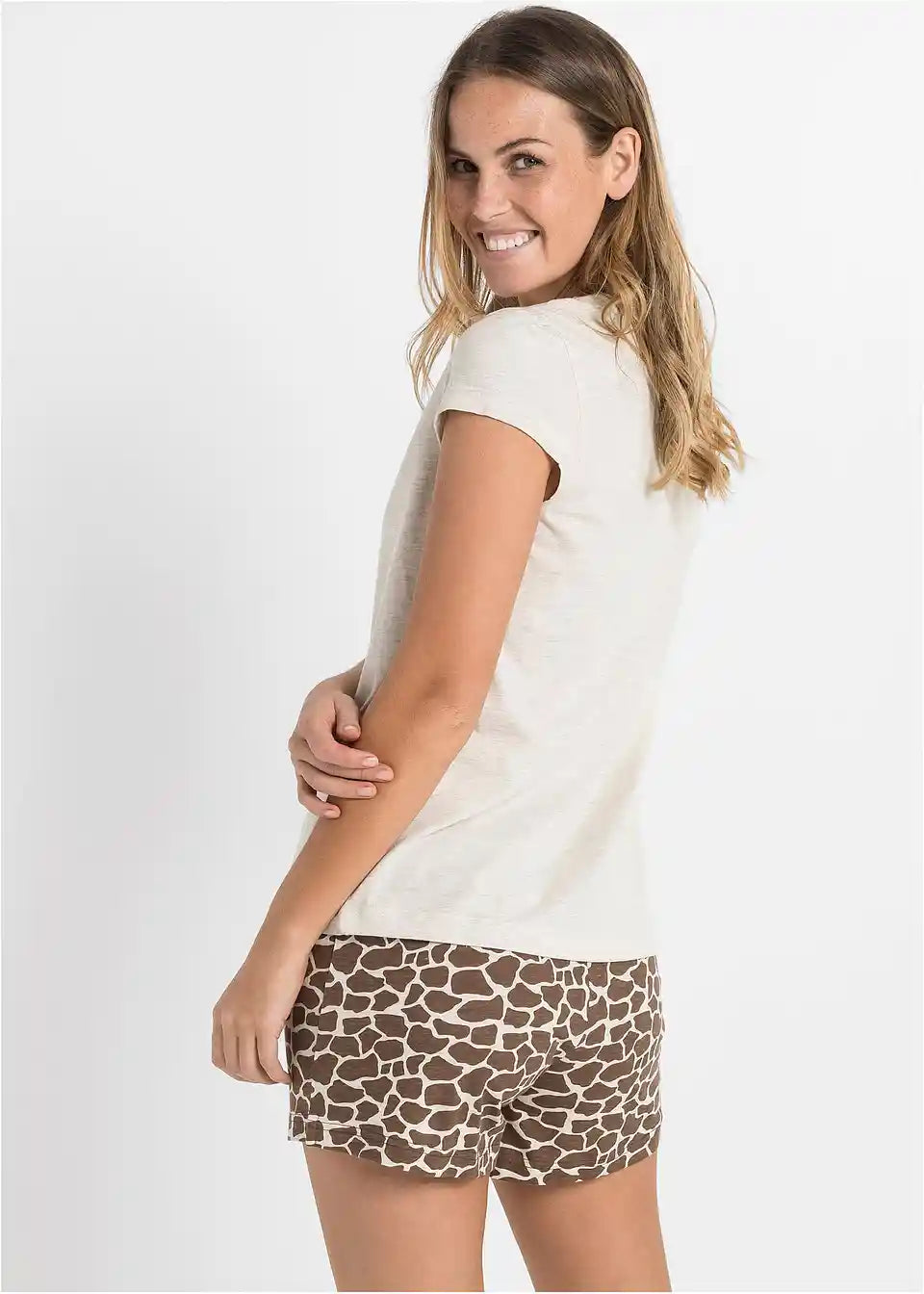 Majica kratke pidžame izrađena je s okruglim izrezom i kratkim rukavima. Mala nabiranje na rukavima i prava prišivena mašnica pridonose ženstvenom izgledu. Shorts dolaze s elastičnim pojasom i podesivom vezicom.