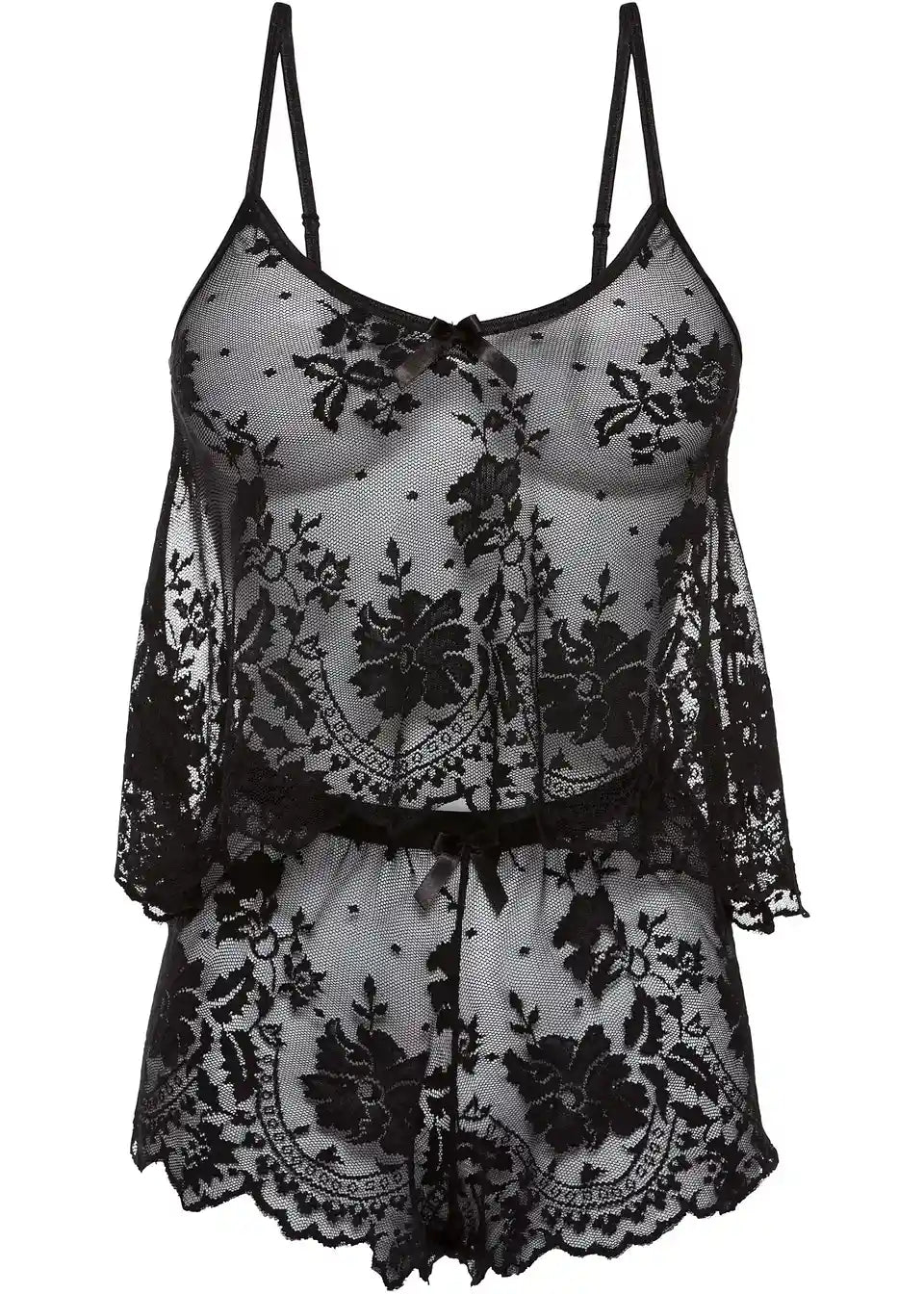 Ženski dvodijelni komplet od čipkastog topa s odgovarajućim gaćicama obavija vaše obline nježnom čipkom i nudi ugodan osjećaj nošenja. Kao ukrasni dodatak tu su dekorativna mašnica na izrezu topa i u sredini elastičnog dijela gaćica. Prozirnost tkanine izaziva želju za više i privlači pogled vašeg partnera prema vama.