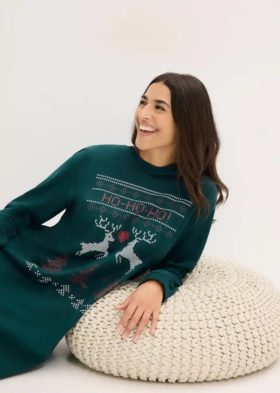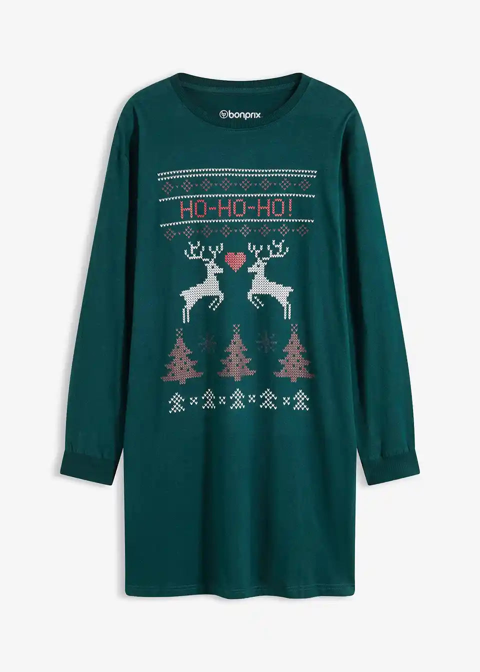 Udobna spavaćica s lijepim božićnim printom i rebrastim rubom na izrezu oko vrata kao i na završetku rukava