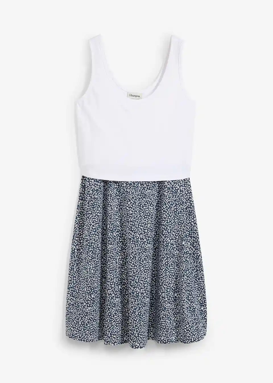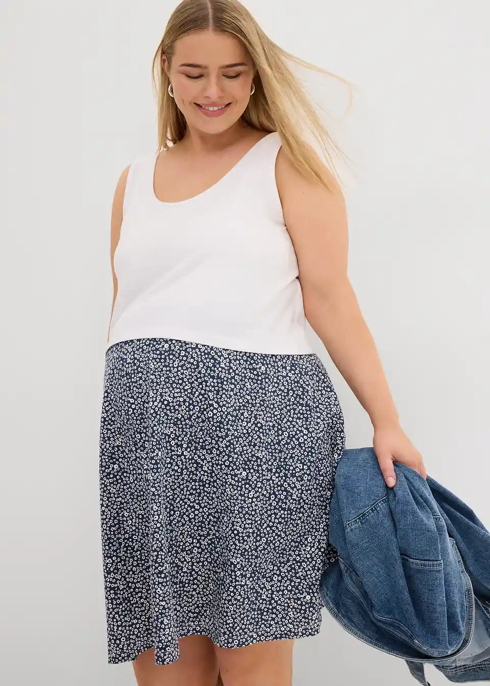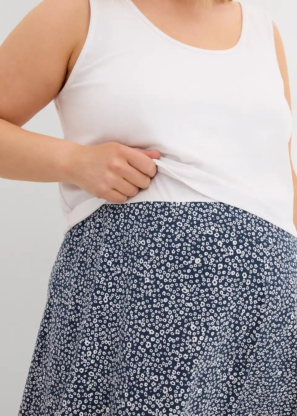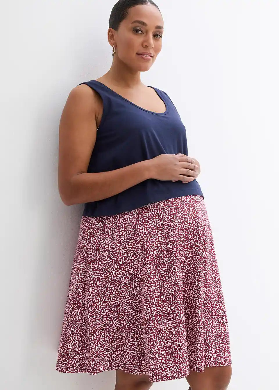 Mekana jersey haljina od organskog pamuka s dodatkom rastezljivih vlakana za visoku udobnost nošenja. S dubokim okruglim izrezom i udobnim naramenicama u stilu potkošulje. Gornji dio je dvostruko slojevit i skriva praktičnu funkciju dojenja. Dizajn s dvostrukim slojevima pomaže u smanjenju gubitka topline i omogućuje ugodno i diskretno dojenje za majku i dijete. Udobna ljetna haljina duljine do koljena s A-kroj suknjom s printom za laskavu siluetu.