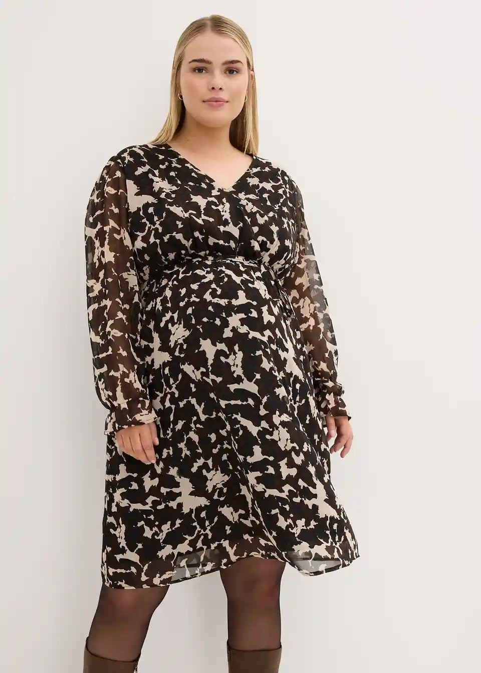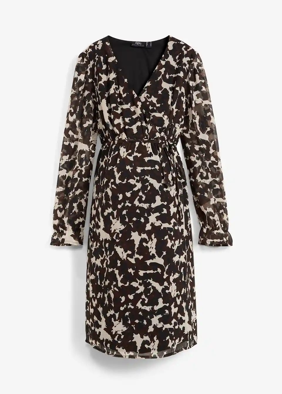 Dugih rukava haljina od šifona s neprozirnom podstavom. S preklopnim izrezom i uskim, odvojivim pojasom na vezanje. Ova haljina se može nositi i tijekom trudnoće i tijekom razdoblja dojenja.
