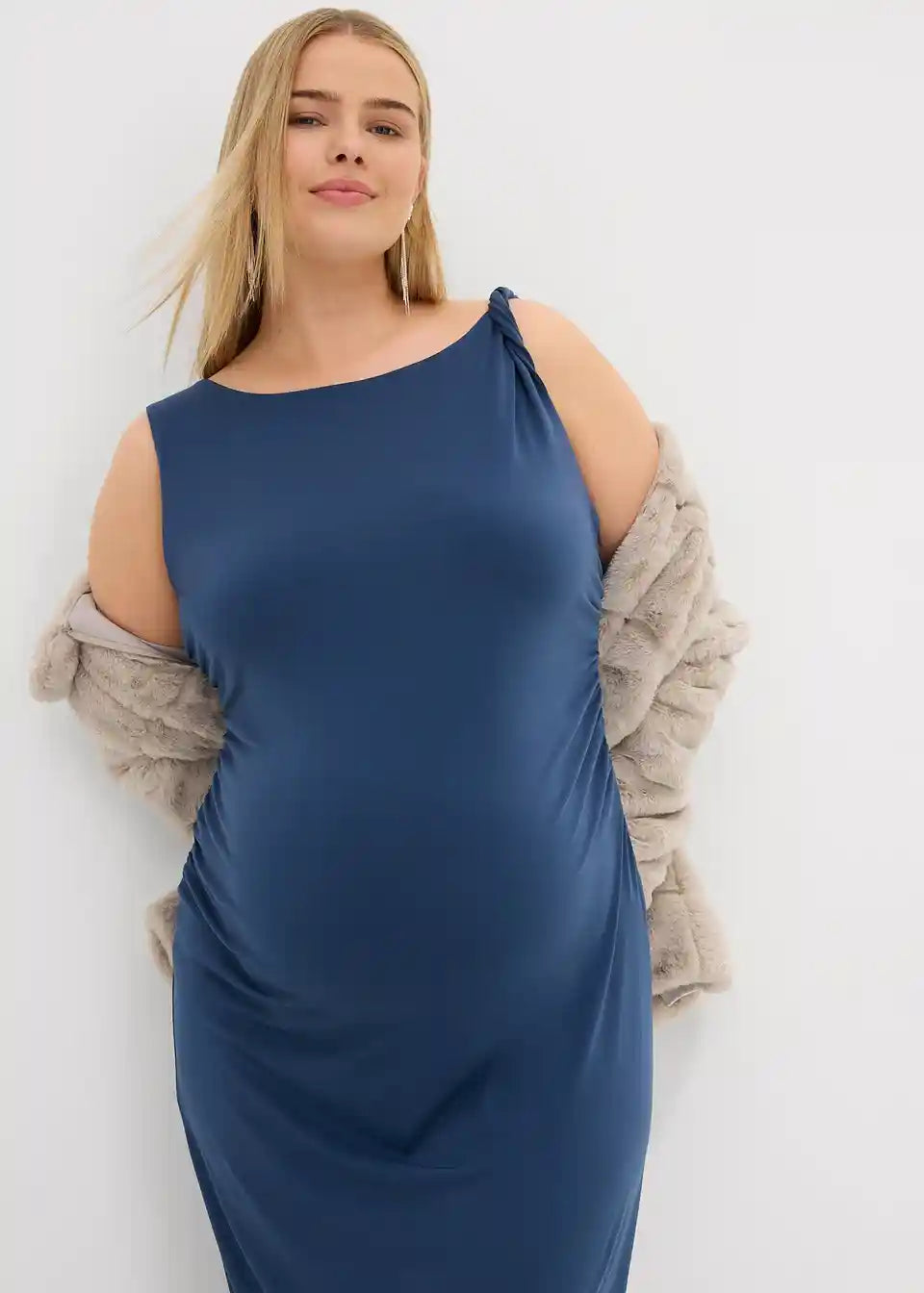 Bezrukavna haljina za trudnice i dojilje od elastičnog jerseya s okruglim izrezom i posebnim detaljem na naramenicama. Bočni nabori ne pružaju samo dovoljno prostora trbuhu da raste nego ga i prikrivaju nakon poroda. Bočni patentni zatvarači na gornjem dijelu omogućuju diskretan i gotovo nevidljiv pristup za dojenje.