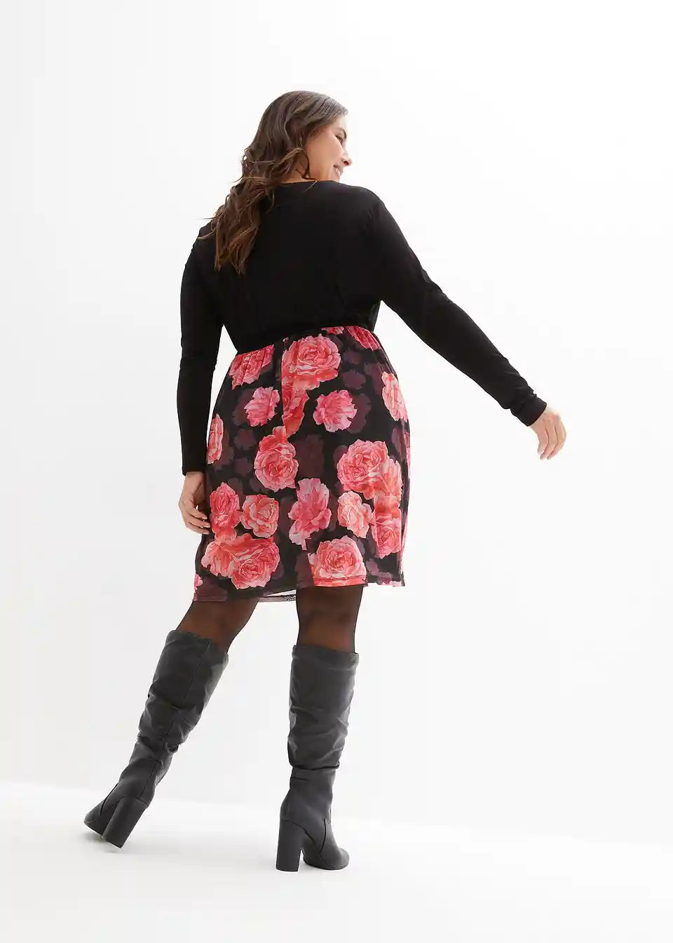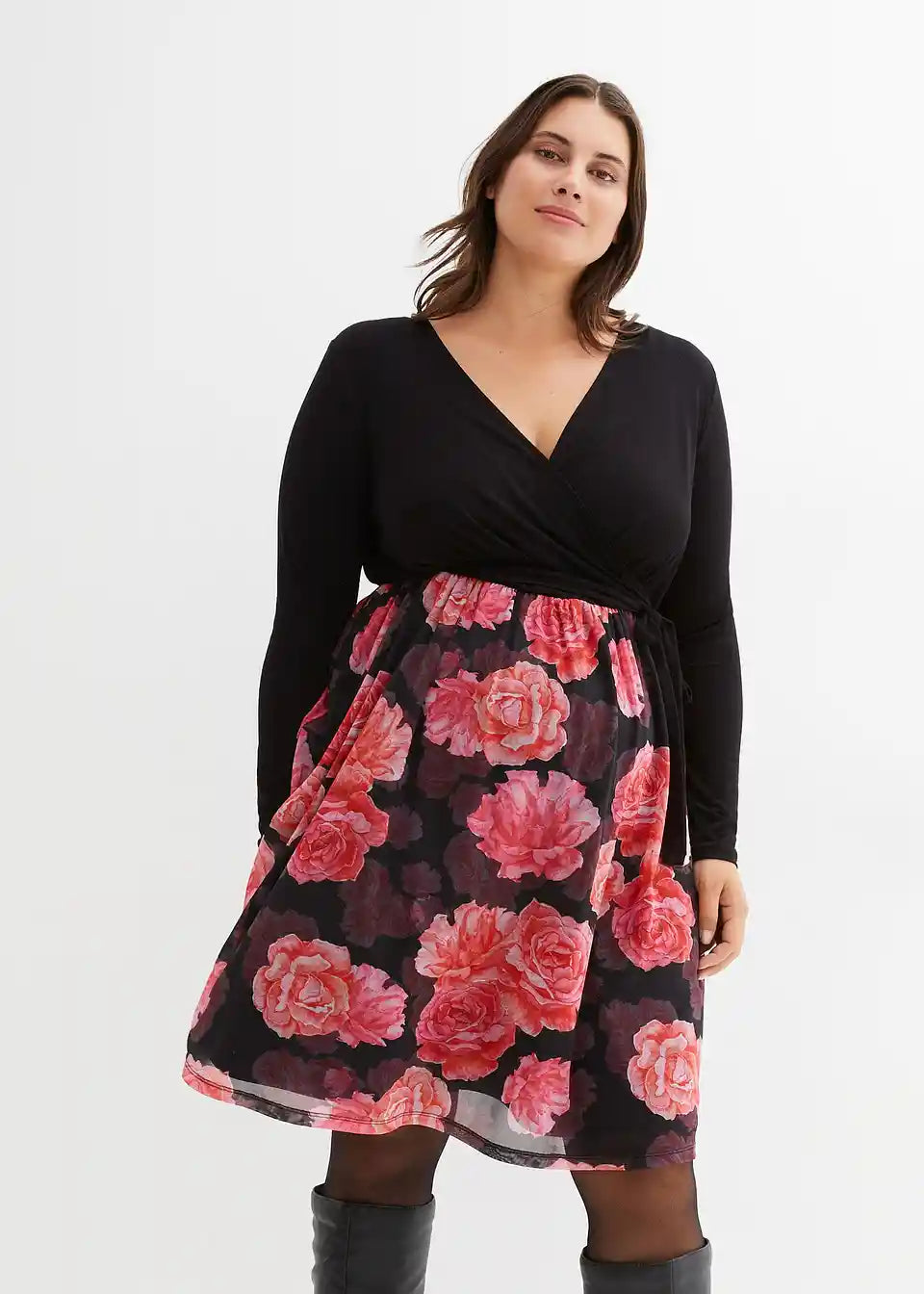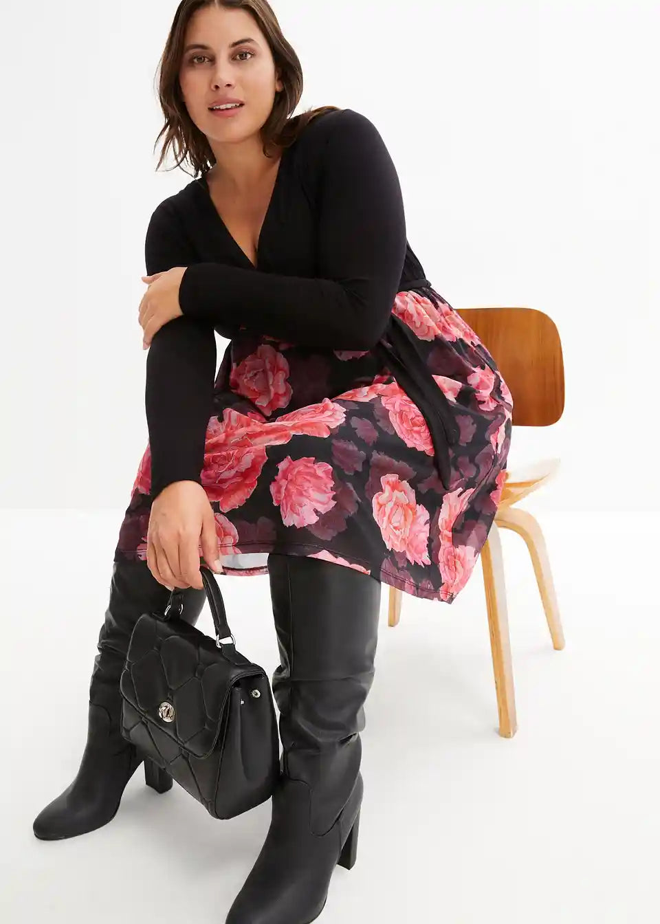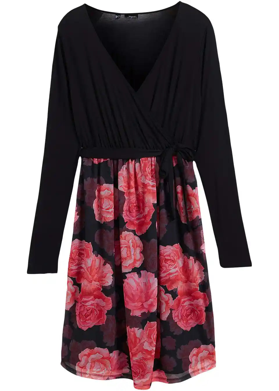 Haljina do koljena s V-izrezom od viskoze. Haljina ima diskretan pristup za dojenje s pomičnim dijelom, jednostavan gornji dio i donji dio s cvjetnim uzorkom.