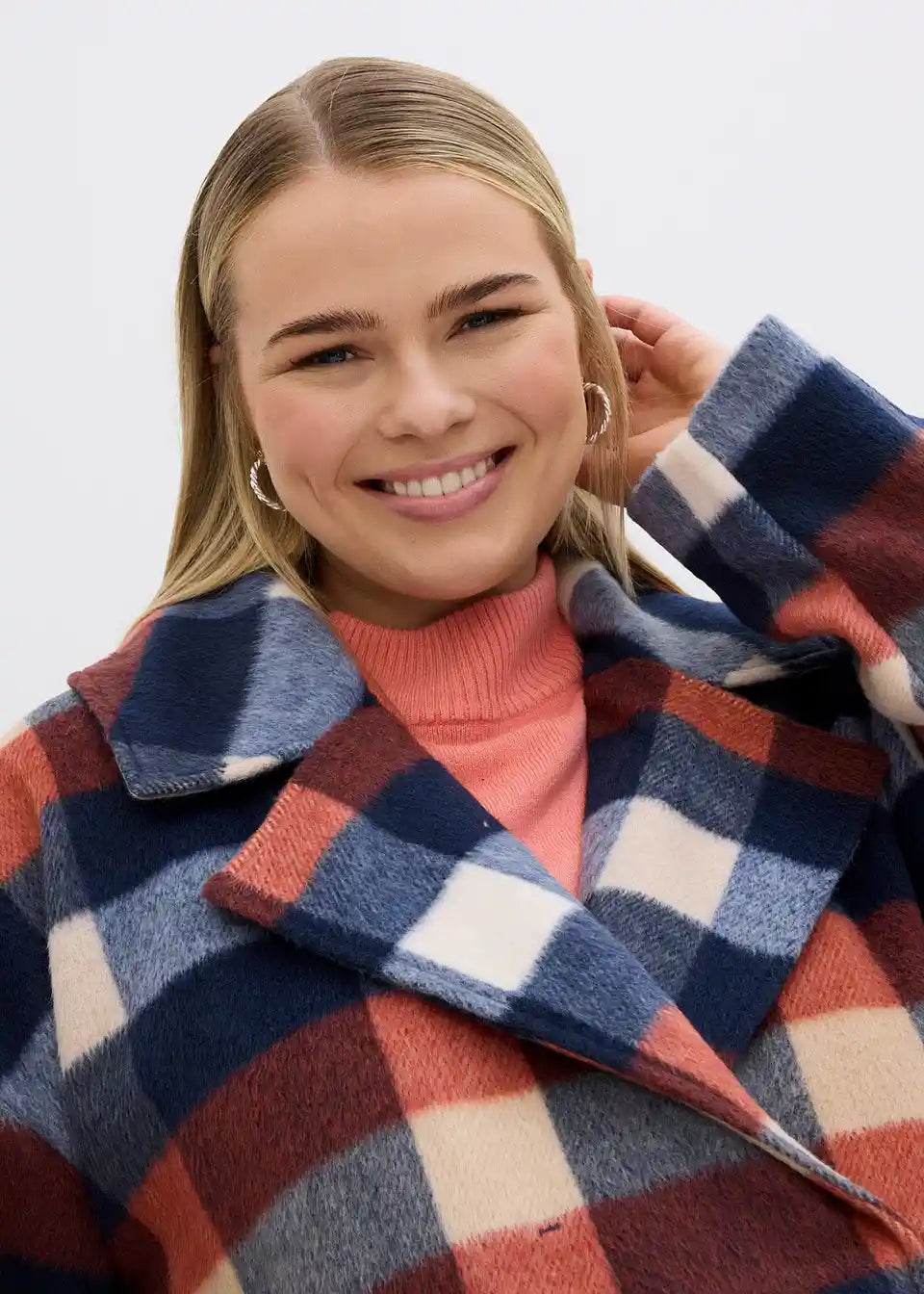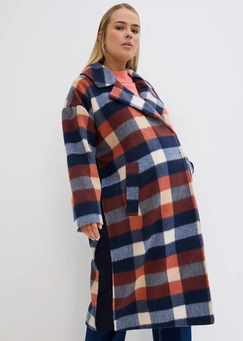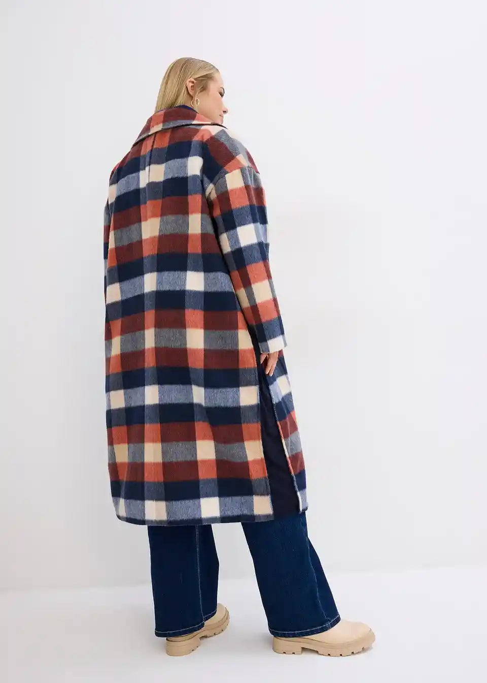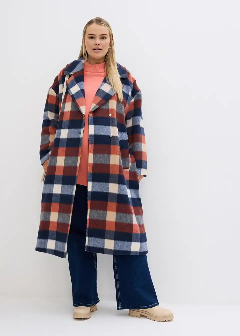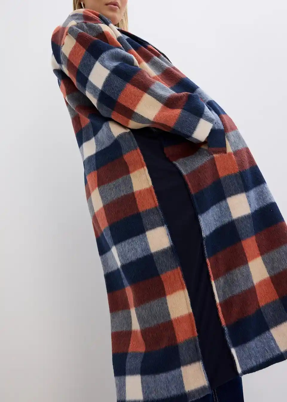 Dugi, karirani kaput od mekanog tkanog materijala s uzdignutim reverom i skrivenim drukerima sprijeda. S bočnim patentnim zatvaračima za regulaciju širine, što omogućava nošenje tijekom i nakon trudnoće. S ušivenim džepovima. Podstavljen.