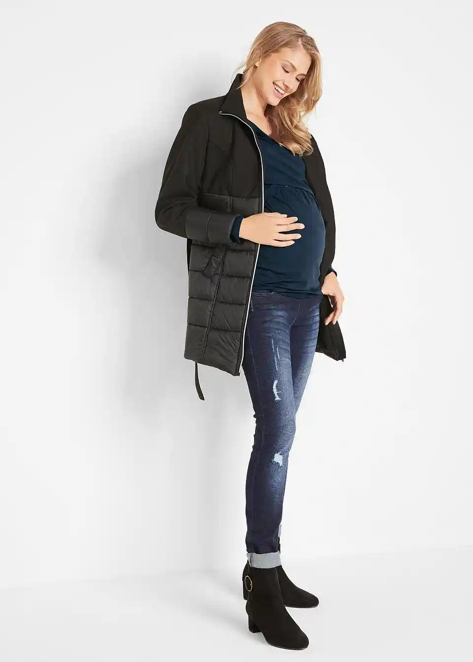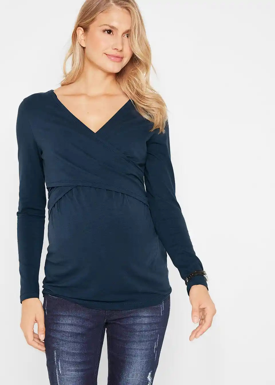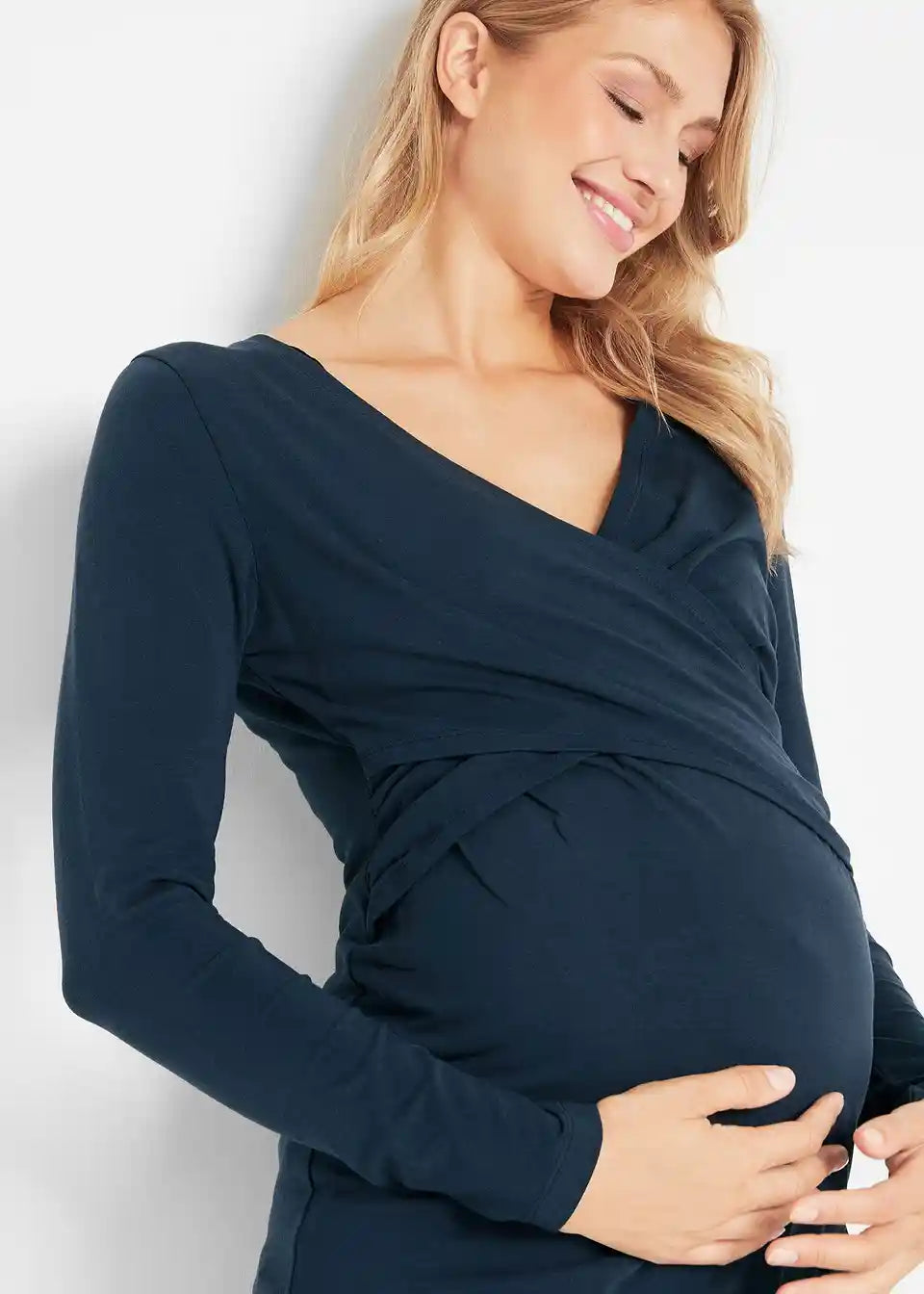 Jersey majica za trudnice od organskog pamuka s funkcijom za dojenje. S dugim rukavima i dubokim V-izrezom. Preklopljeni izrez omogućuje dojenje.