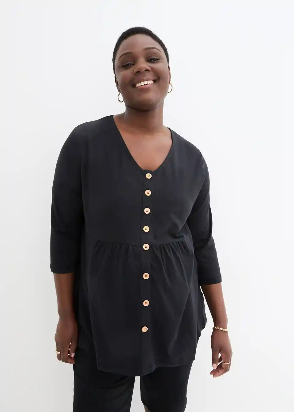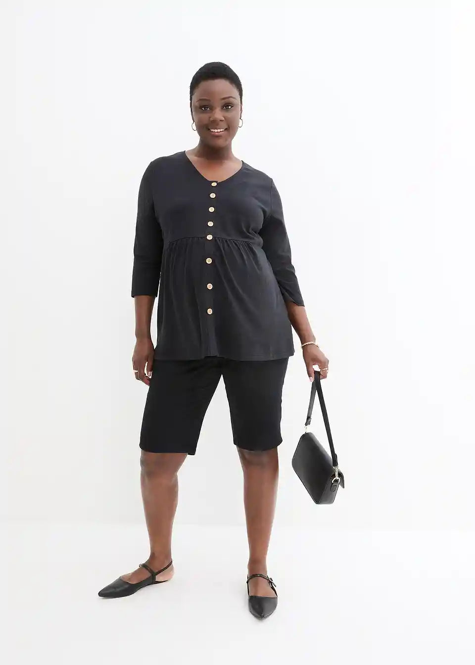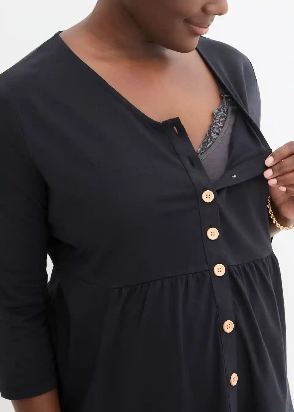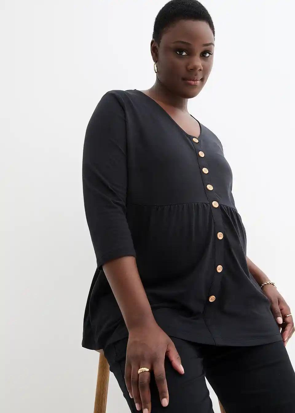 Meka majica za trudnice od elastičnog jerseya od organskog pamuka. S okruglim izrezom i 3/4 rukavima. Dekorativni gumbi omogućuju jednostavno dojenje.