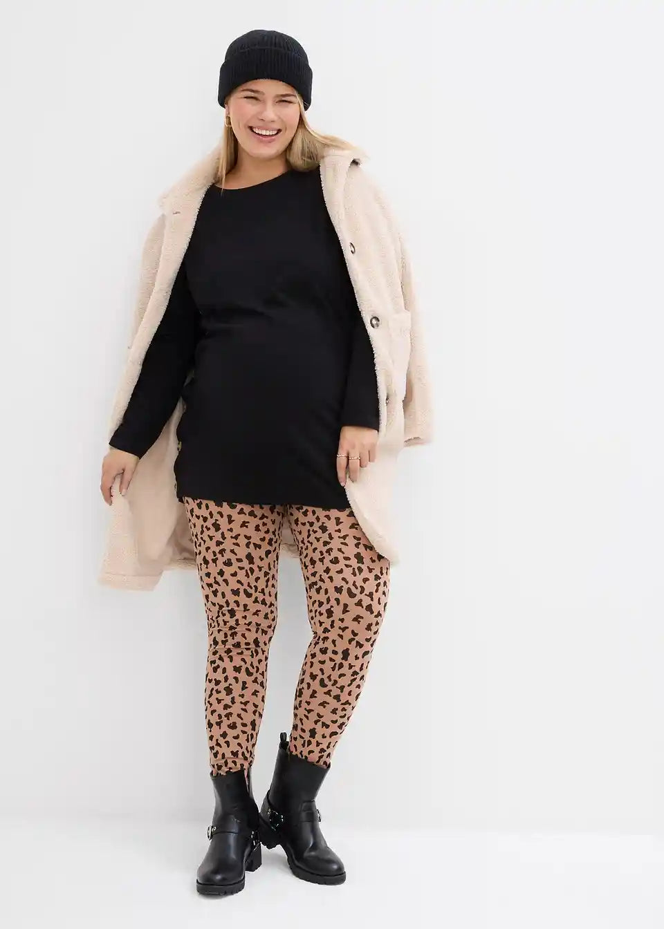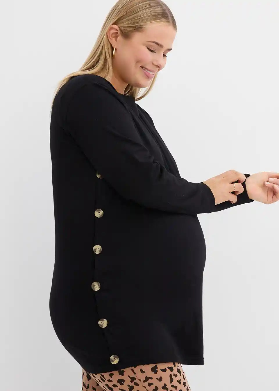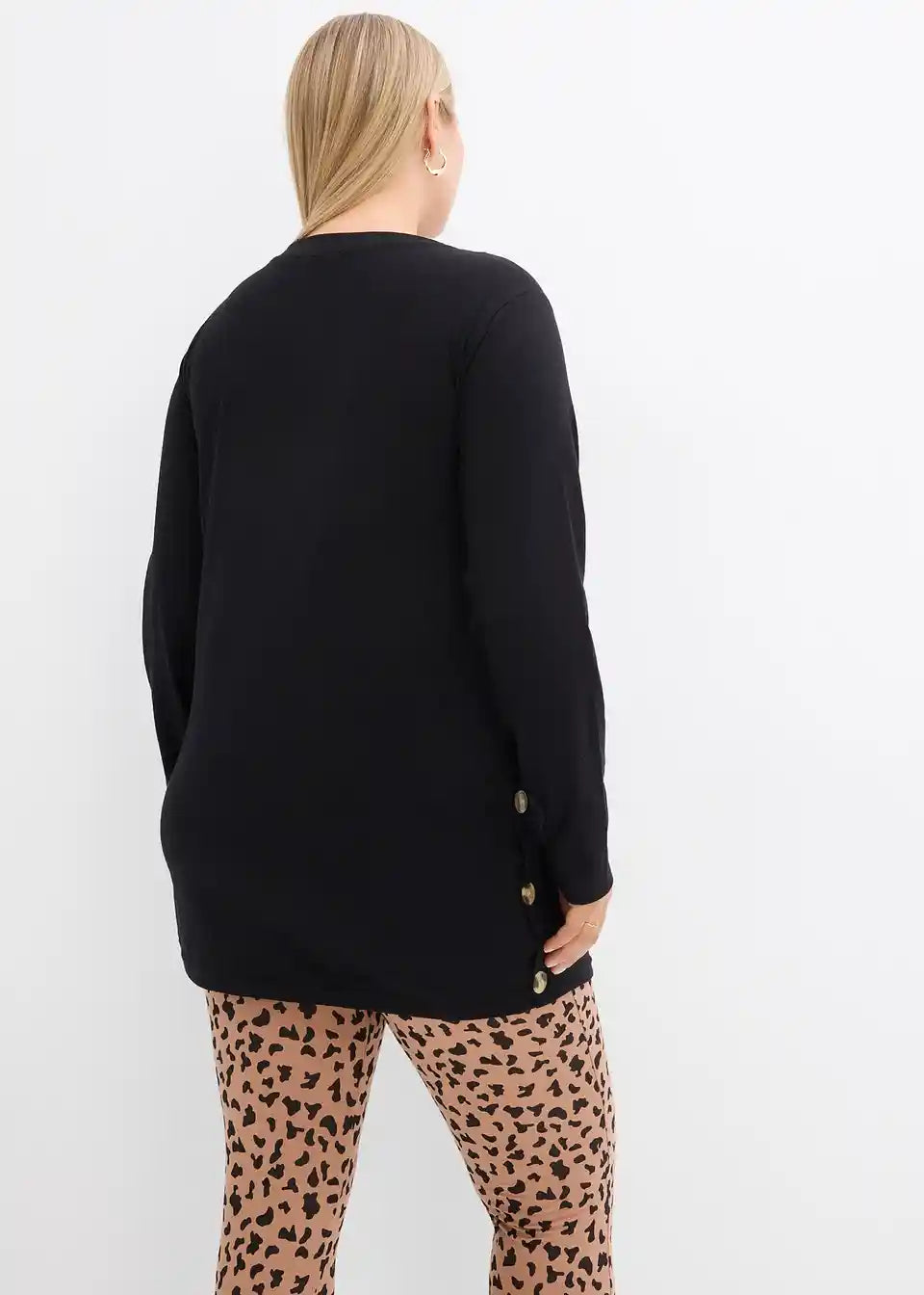 Majica od organskog pamuka koja prekriva bokove, s elastinom. S okruglim izrezom i dugim rukavima. Bočni gumbi omogućuju fleksibilno prilagođavanje širine i ujedno služe kao funkcija za dojenje.