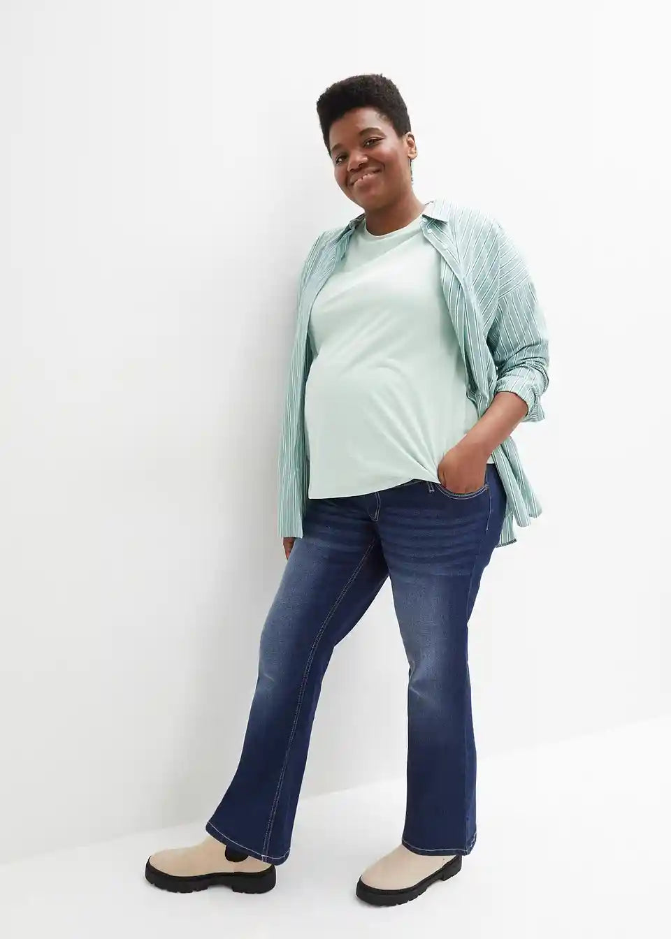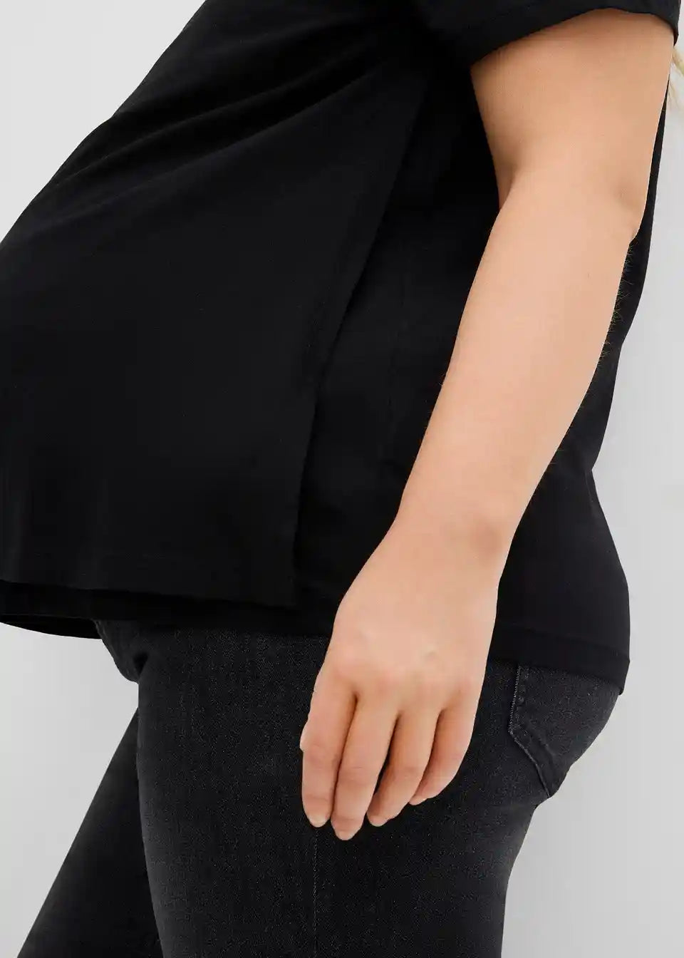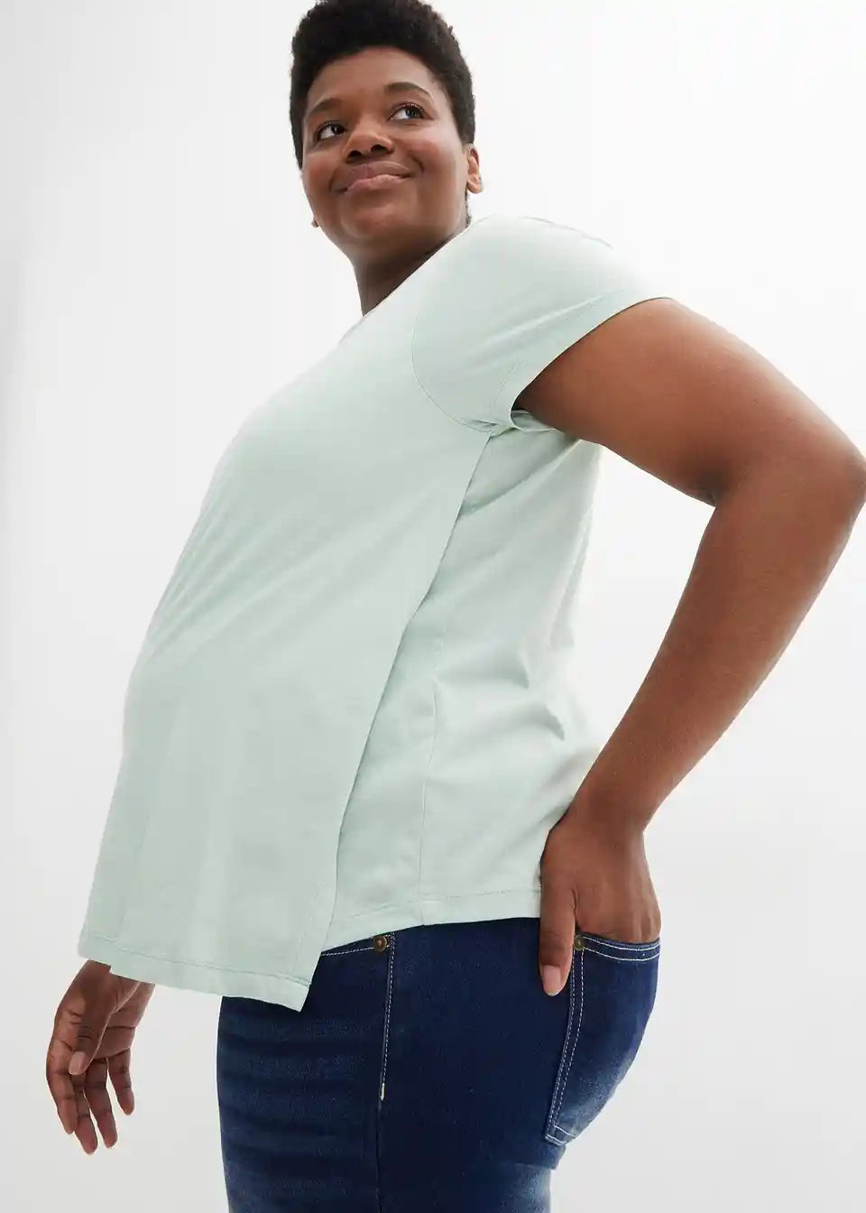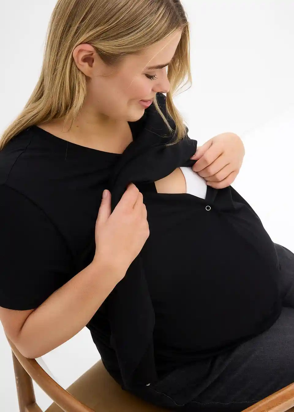 Mekane majice za trudnice od džerseja s diskretnom funkcijom dojenja uz bočni prorez za podizanje. Dizajn s dvostrukim slojevima pomaže u sprječavanju gubitka topline i omogućuje ugodno dojenje za majku i dijete.