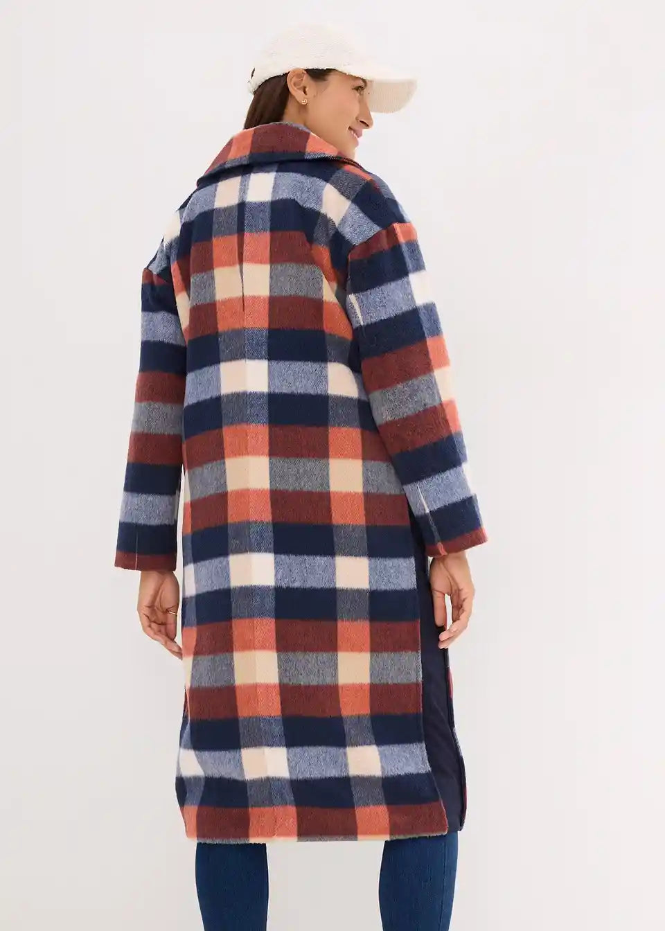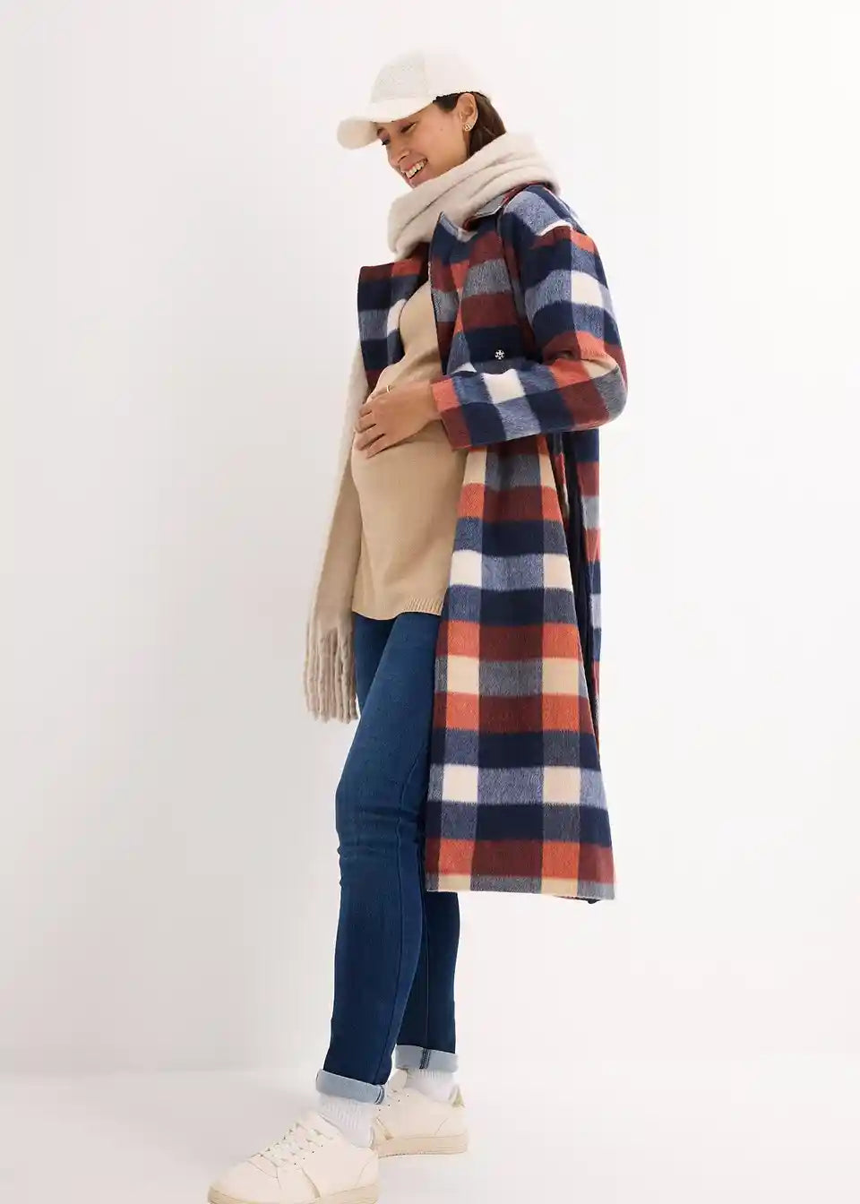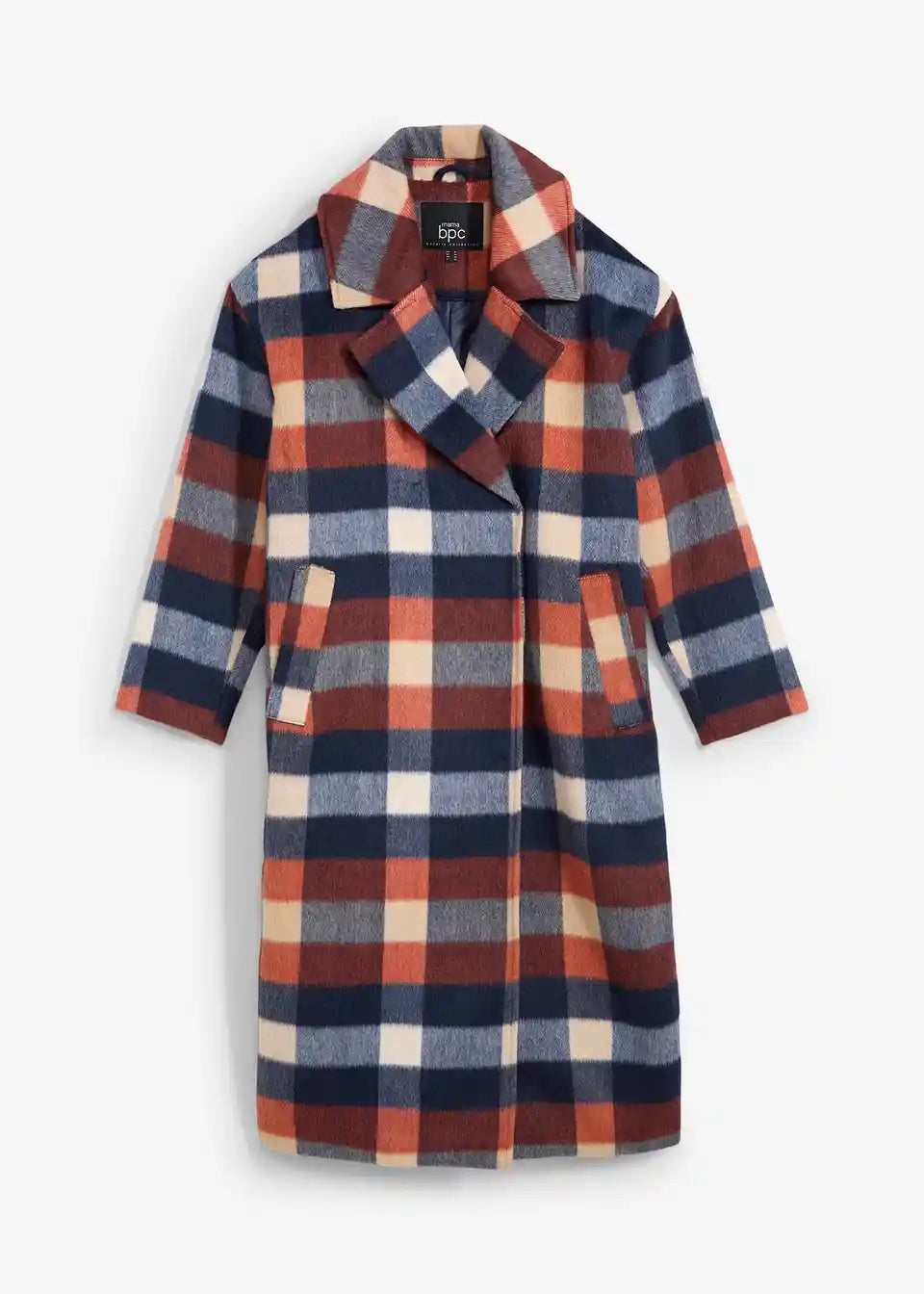 Dugi karirani kaput od mekog tkanog materijala s reverima i skrivenim drukerima sprijeda. S bočnim patentnim zatvaračima za regulaciju širine, omogućuje nošenje tijekom trudnoće i nakon nje. S ušivenim džepovima. Podstavljen.