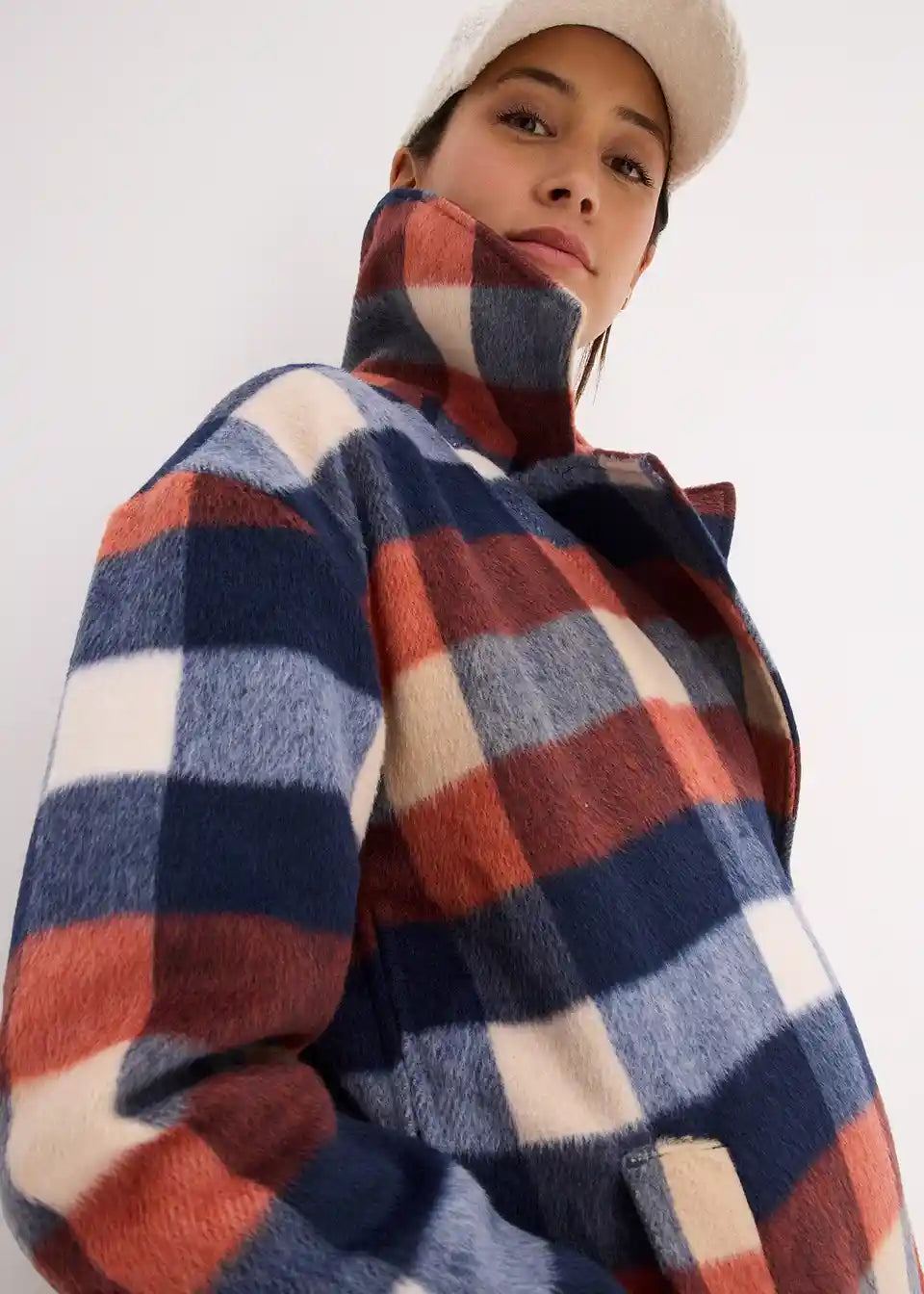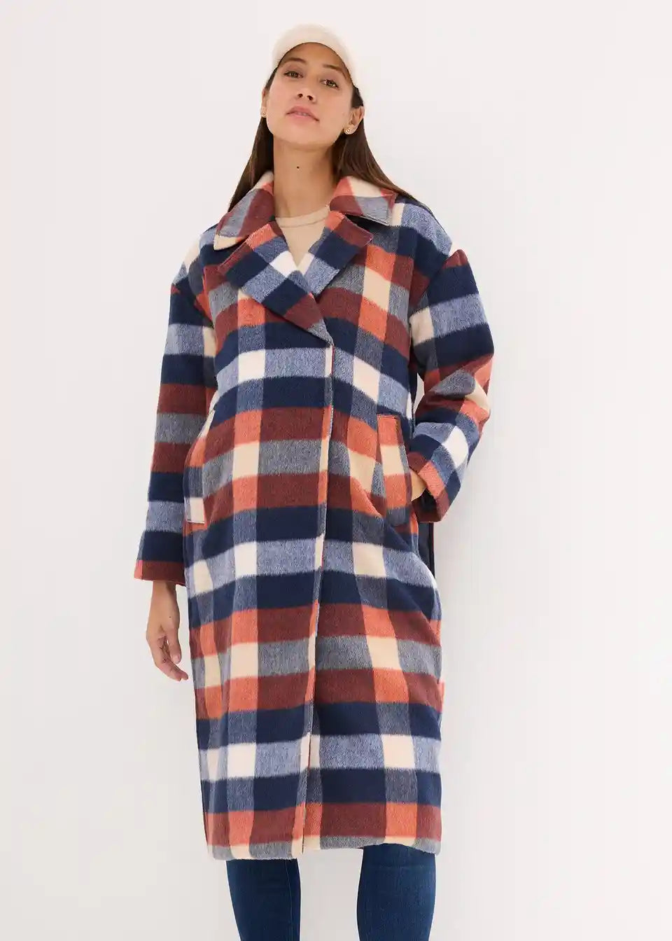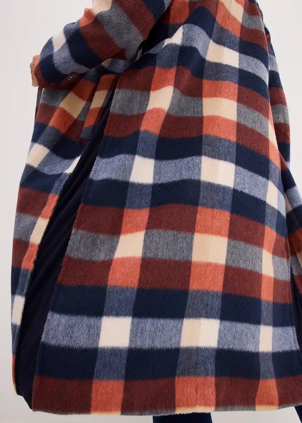 Dugi karirani kaput od mekog tkanog materijala s reverima i skrivenim drukerima sprijeda. S bočnim patentnim zatvaračima za regulaciju širine, omogućuje nošenje tijekom trudnoće i nakon nje. S ušivenim džepovima. Podstavljen.